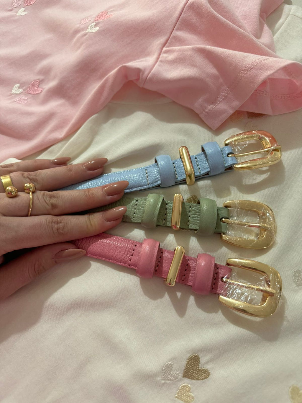 Descrição: cinto candy nas cores verde menta, rosa e azul bebê em COURO