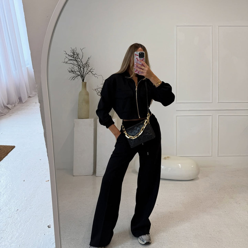 Conjunto em moletinho super confortável, com jaqueta cropped de zíper e bolsos utilitários, ideal para um visual casual e moderno.