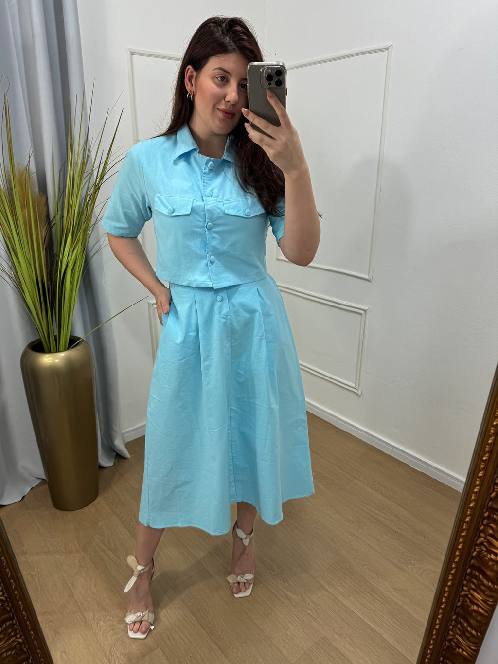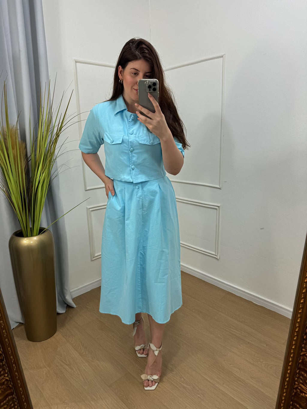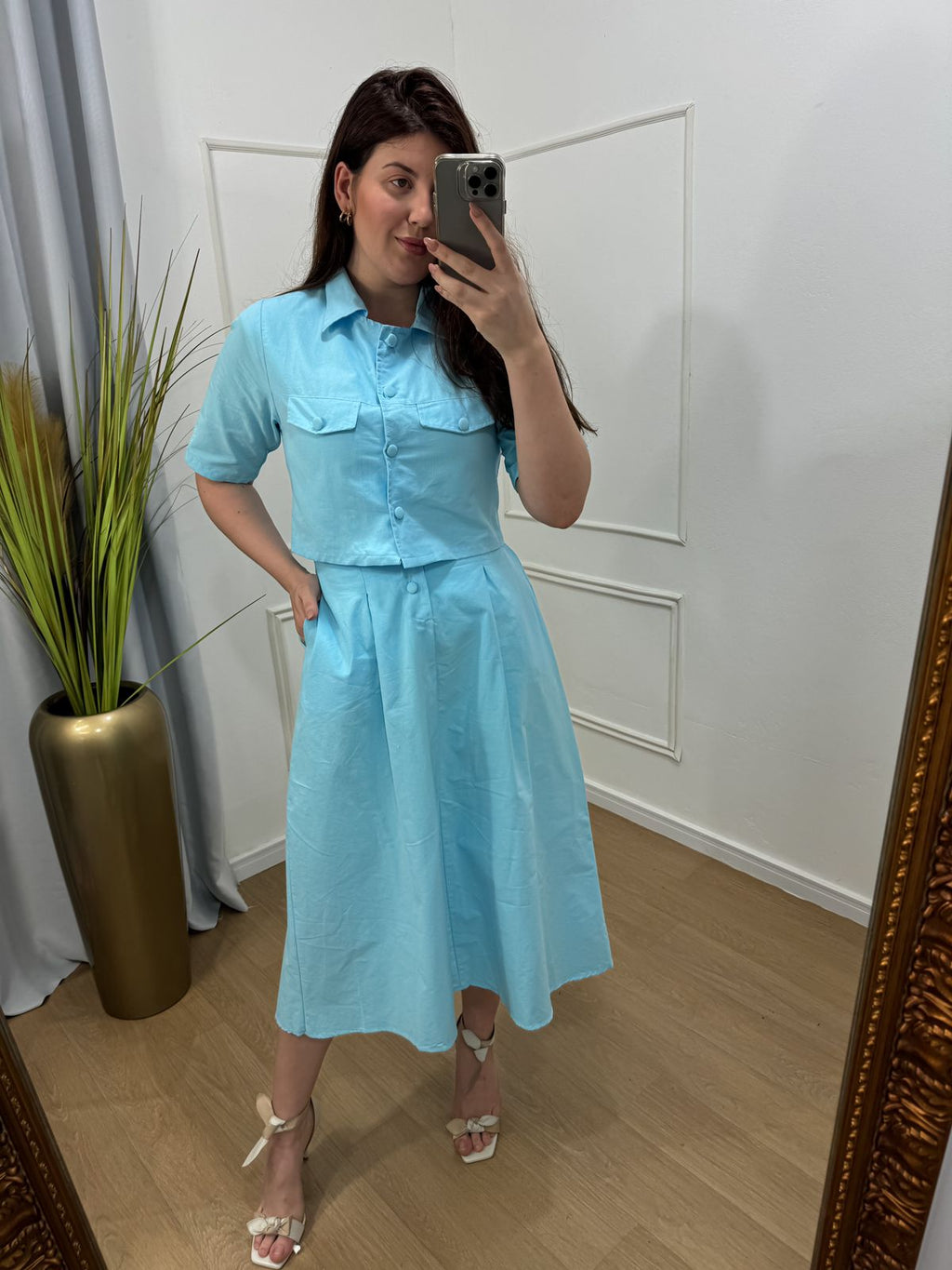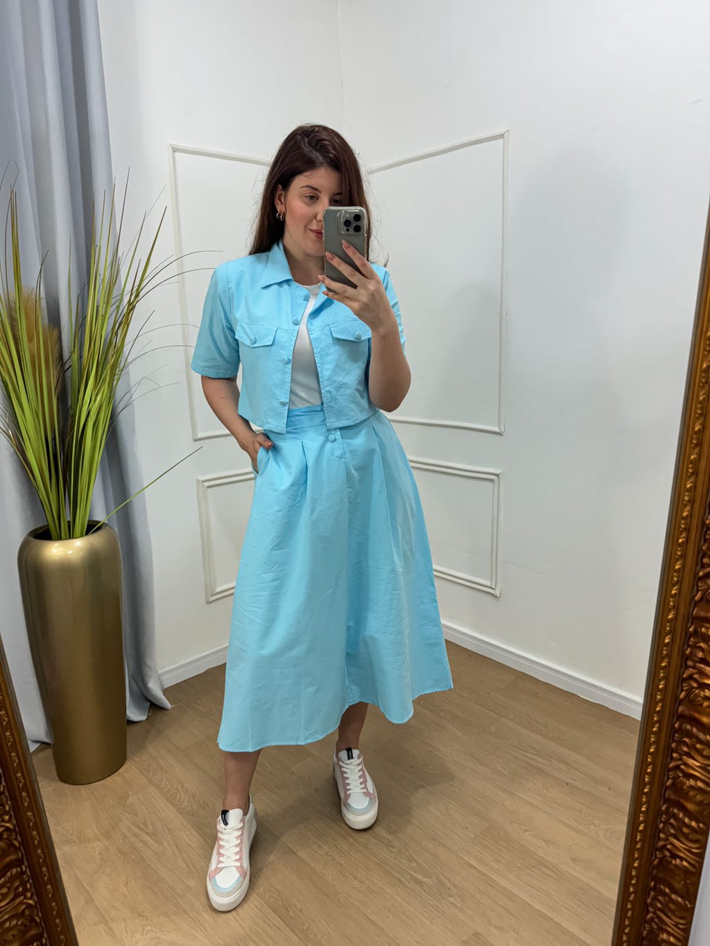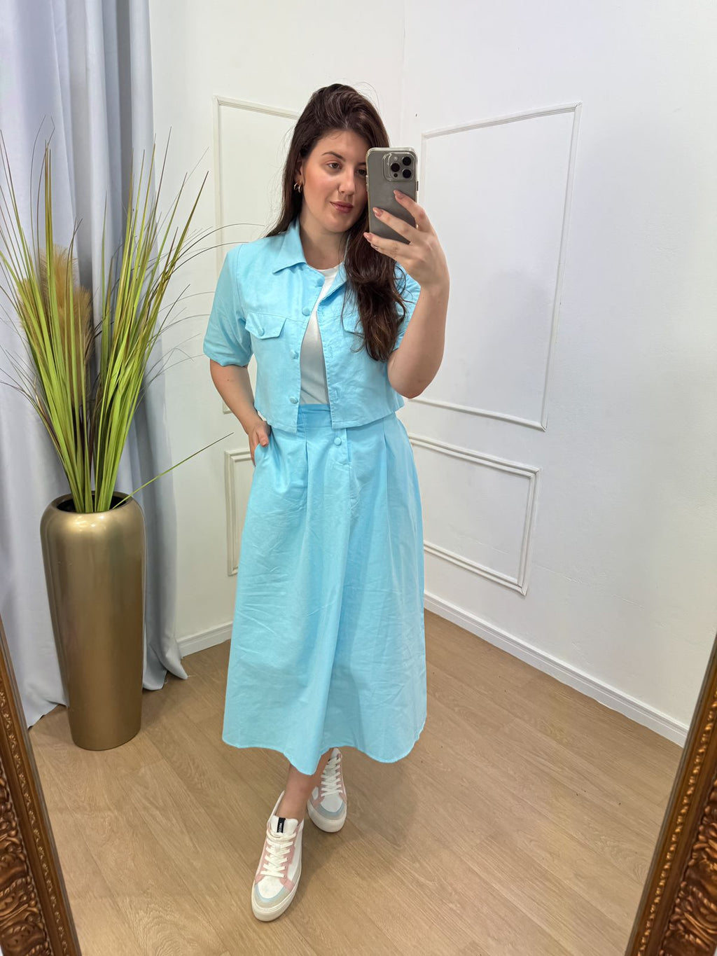 Descrição: conjunto no tecido plano tricoline com toque em viscose possui bolso , elástico no cos , saia midi.