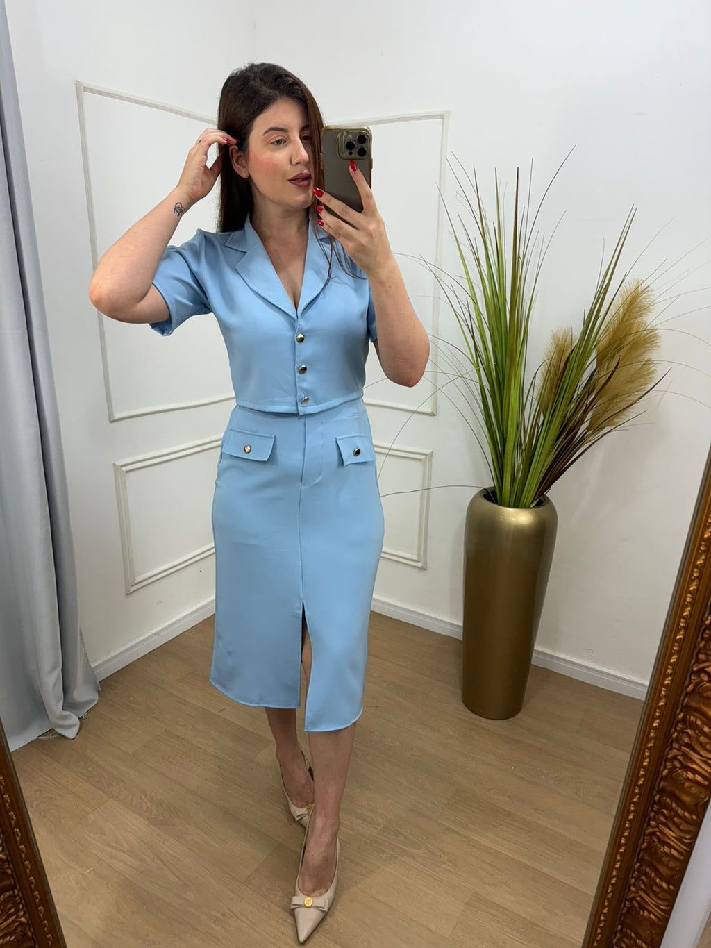 Conjunto na alfaiataria crepe , casaqueto os botões abrem, já botão da saia é só um detalhe.