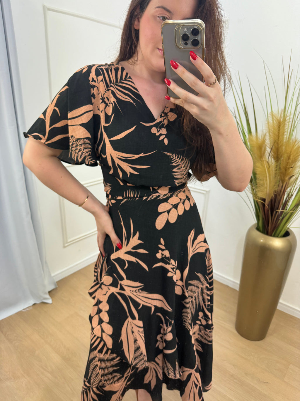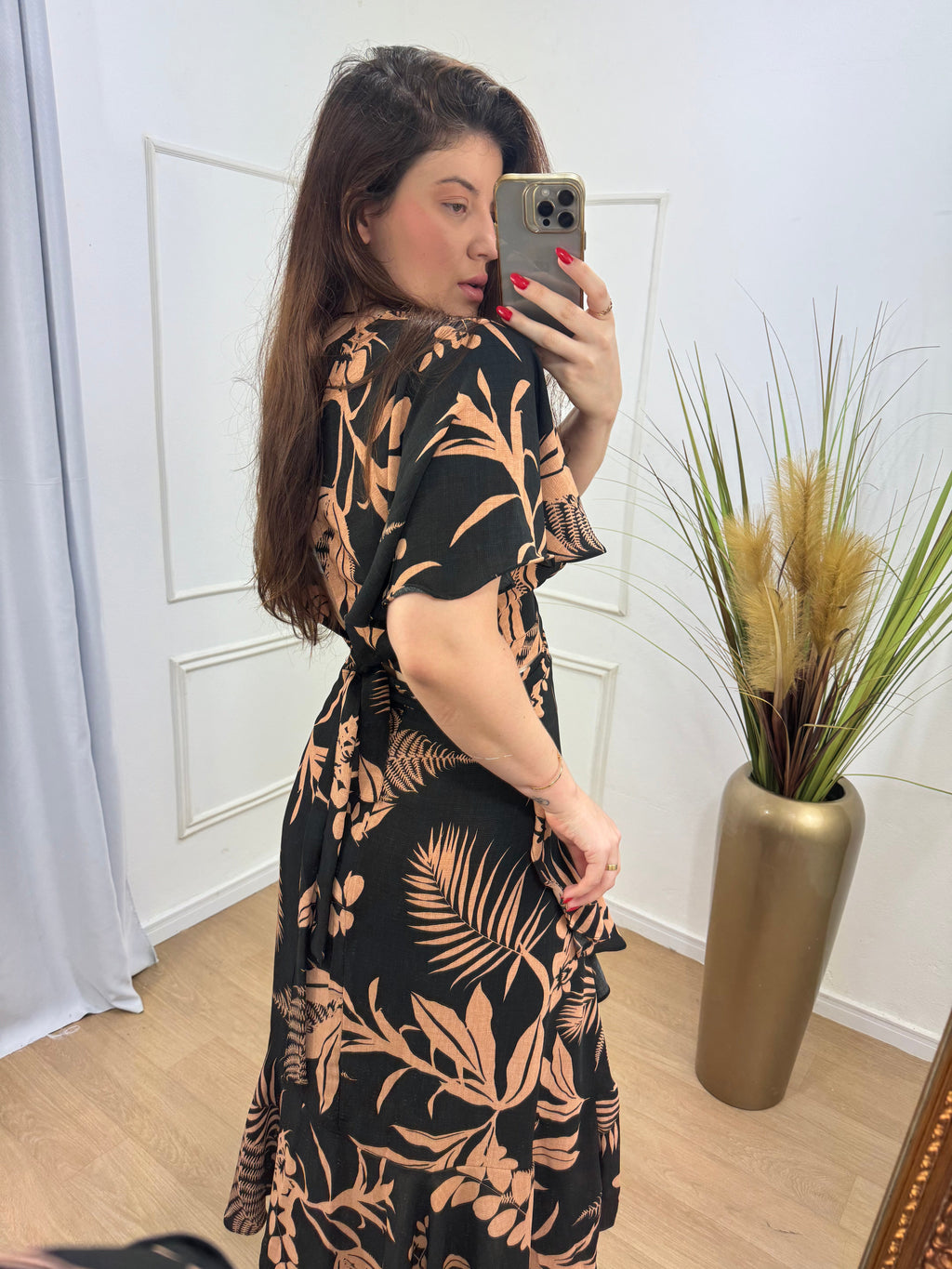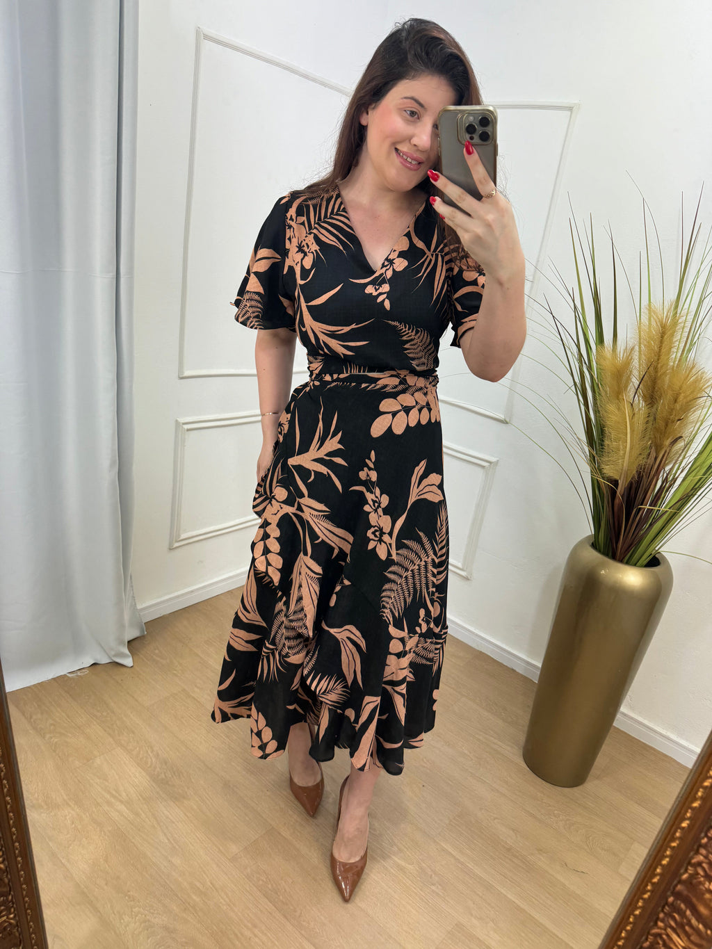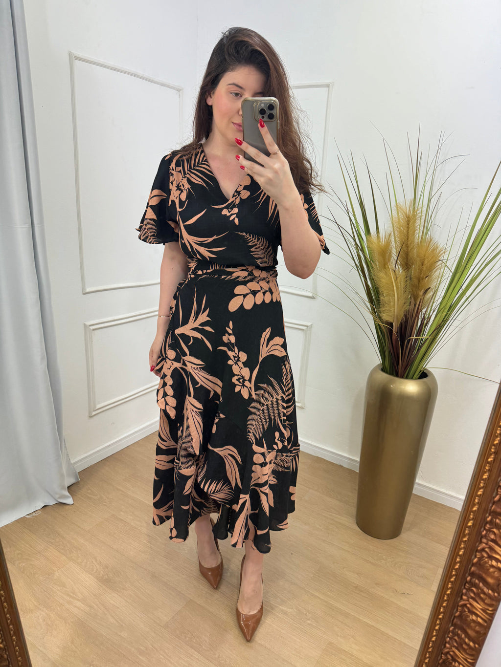 Descrição: conjunto no crepe possui forro na saia que é transpassada , ela possui muito tecido fluida e fica bem fechada e a blusa transpassada nas costas ( vídeo explico bem)
