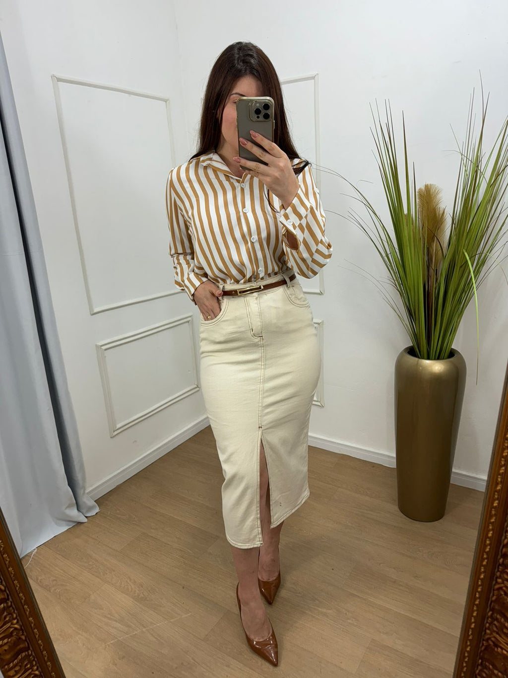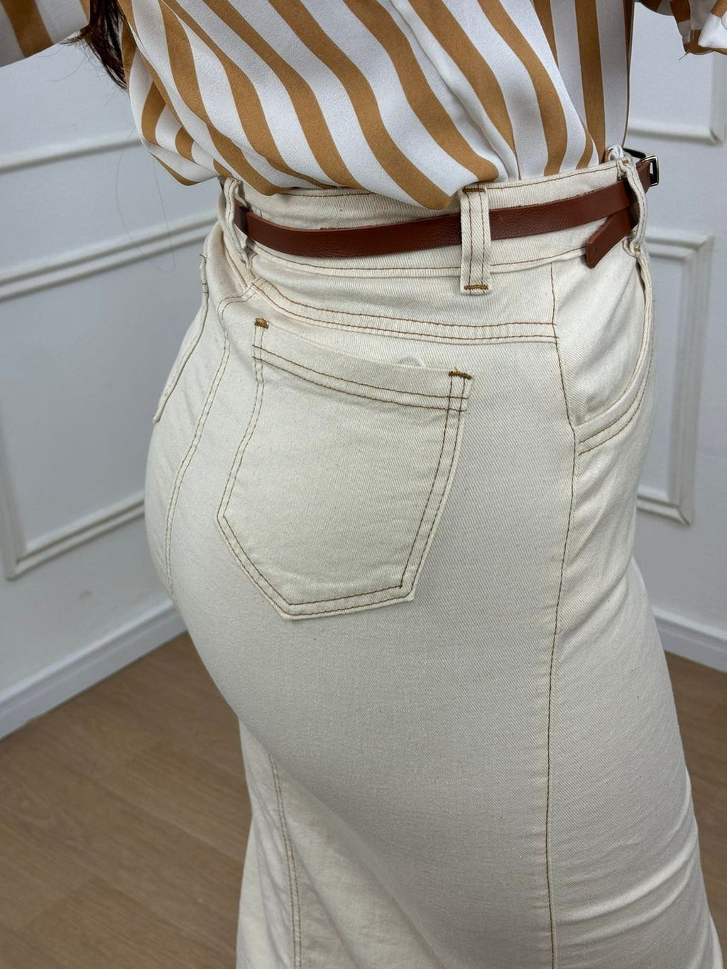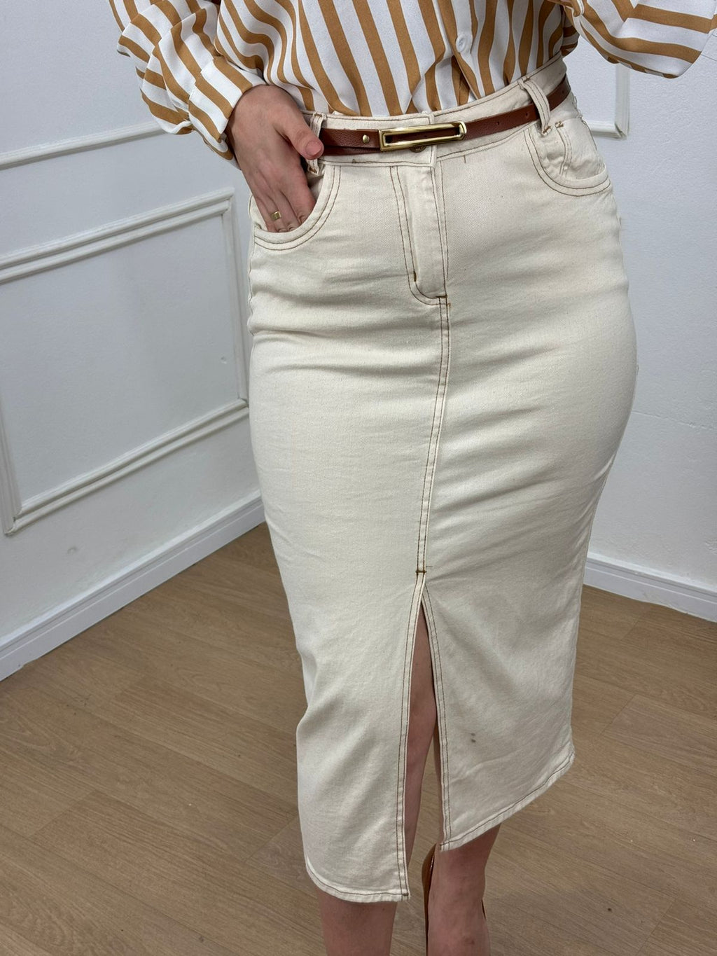 saia jeans com elastano o cinto acompanha, cós alto.
