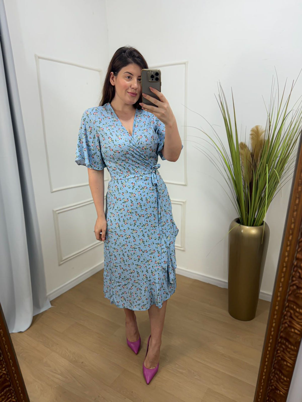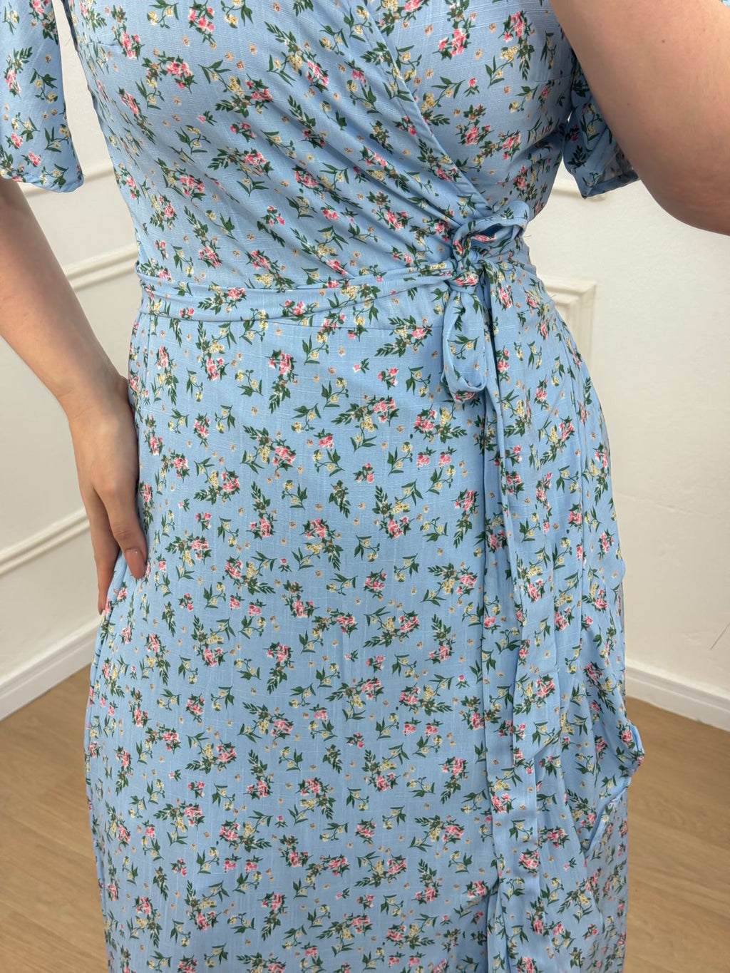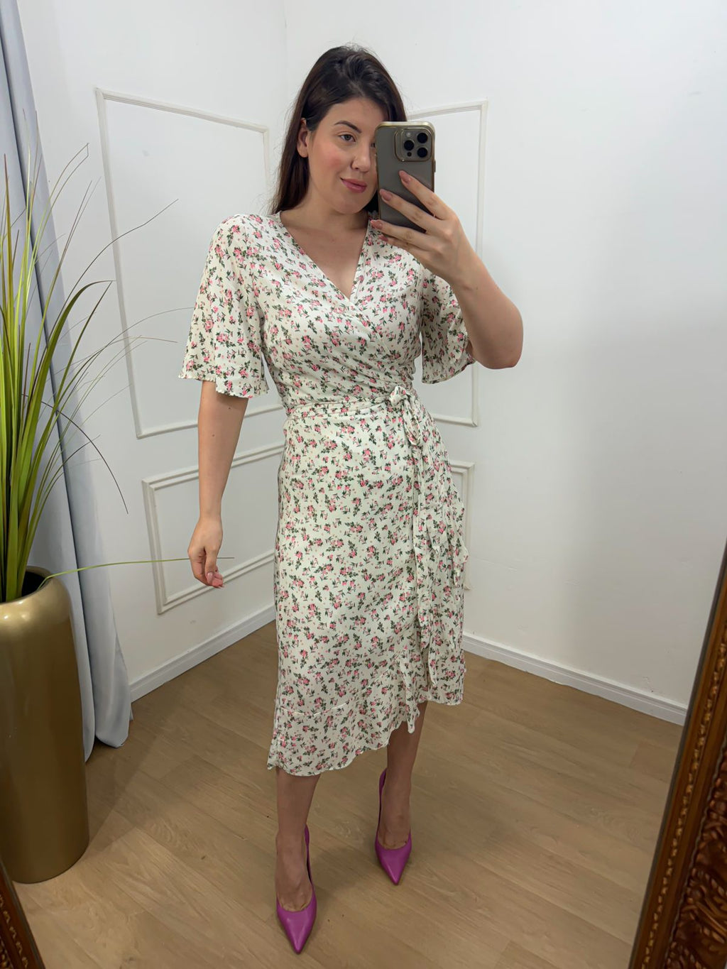 Vestido romântico transpassado forrado ele fica bem fechado pois você mesma que regula através da cintura, babadinho na parte da saia e manga soltinha dando leveza a peça.