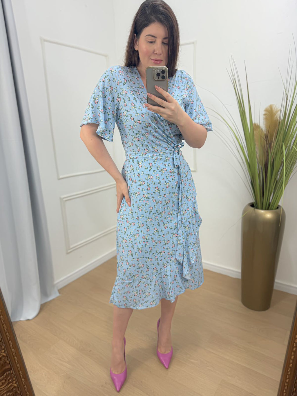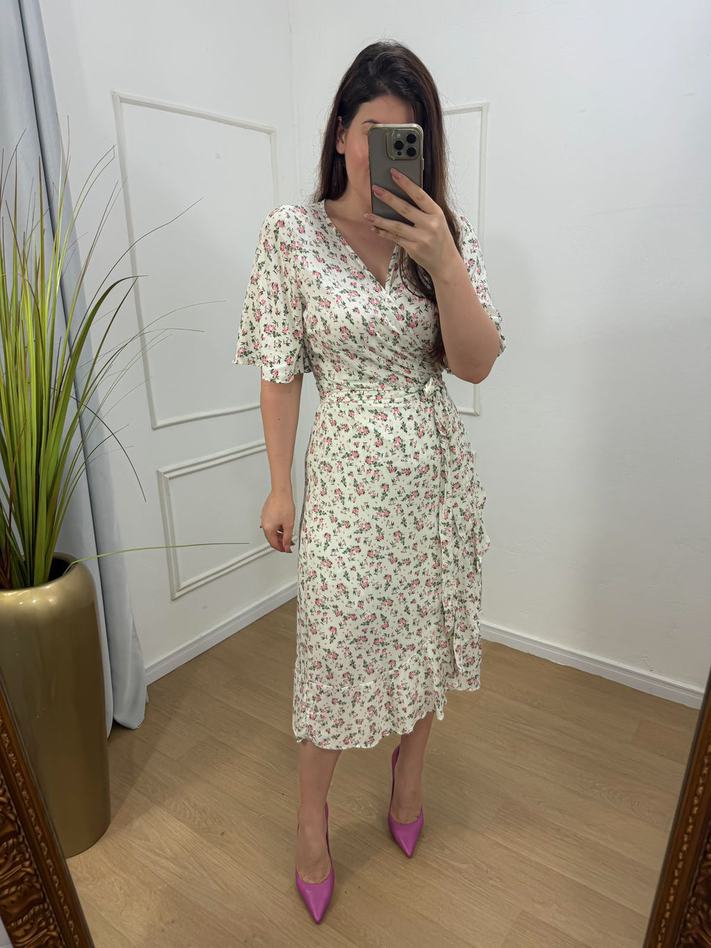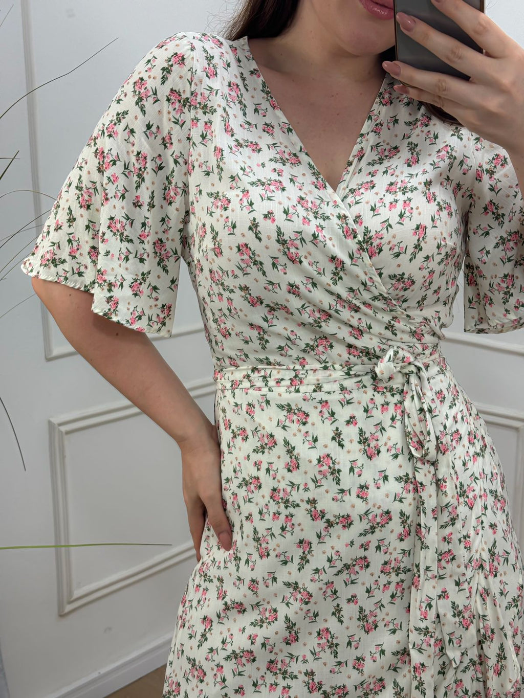 Vestido romântico transpassado forrado ele fica bem fechado pois você mesma que regula através da cintura, babadinho na parte da saia e manga soltinha dando leveza a peça.