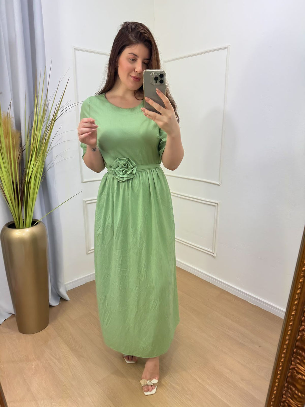 Descrição: vestido midi verde menta acompanha faixa ( a flor você consegue remover) no tecido viscolinho crepado.