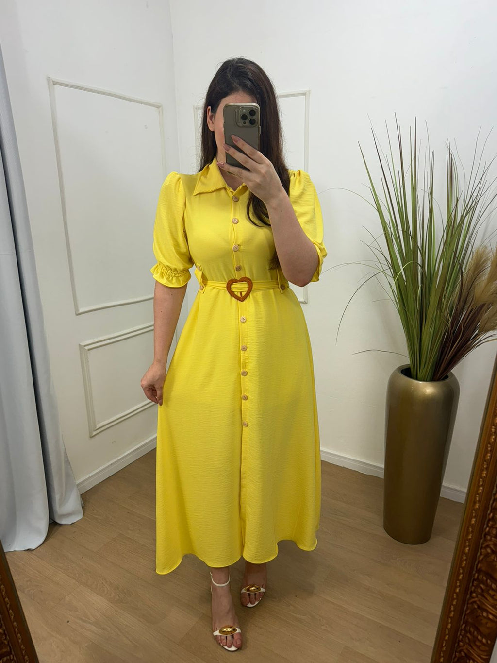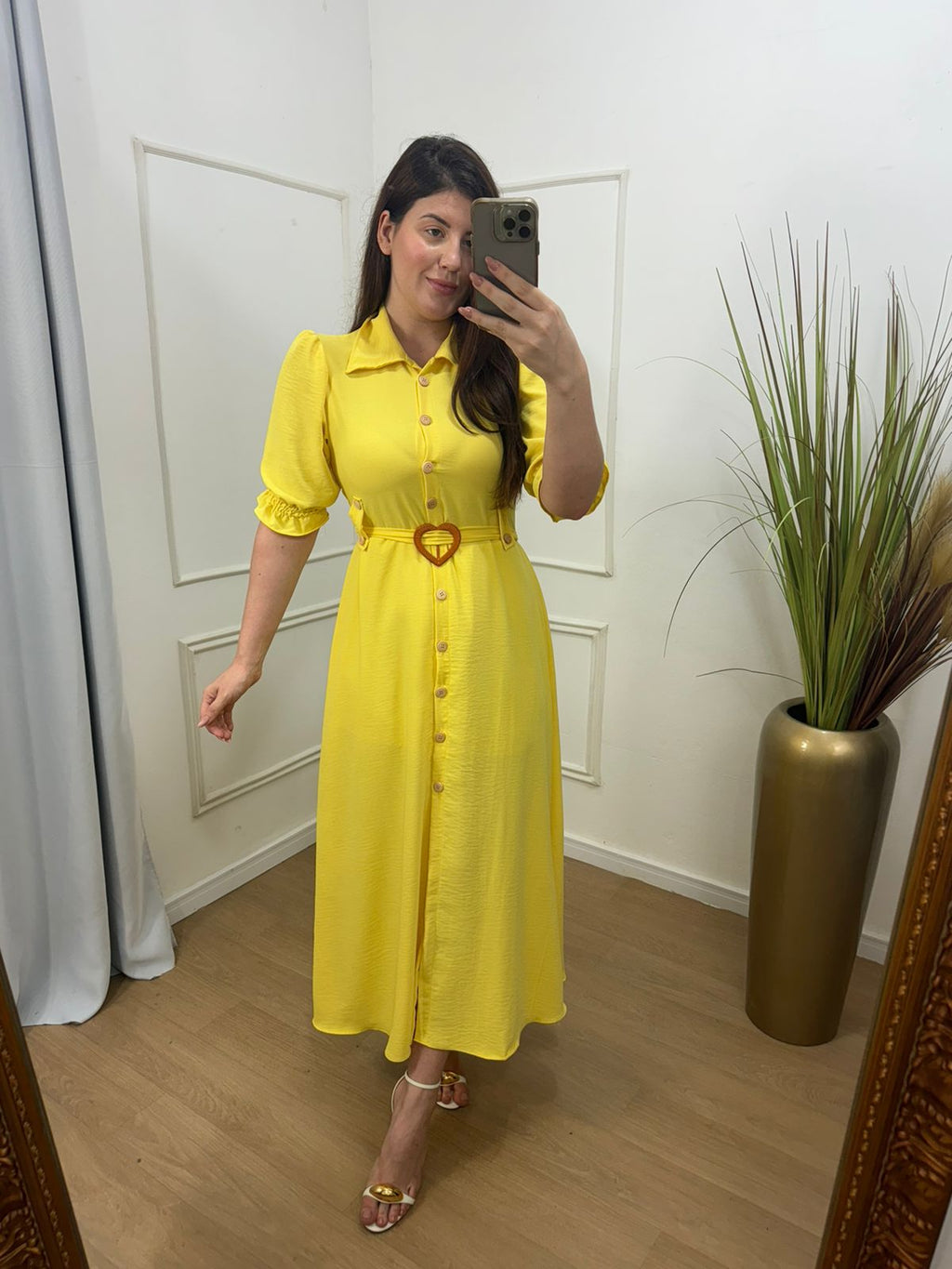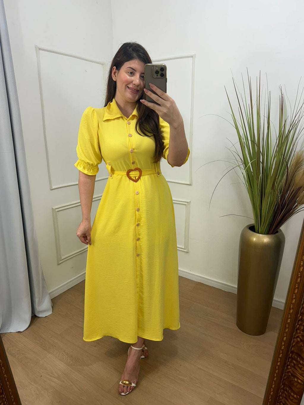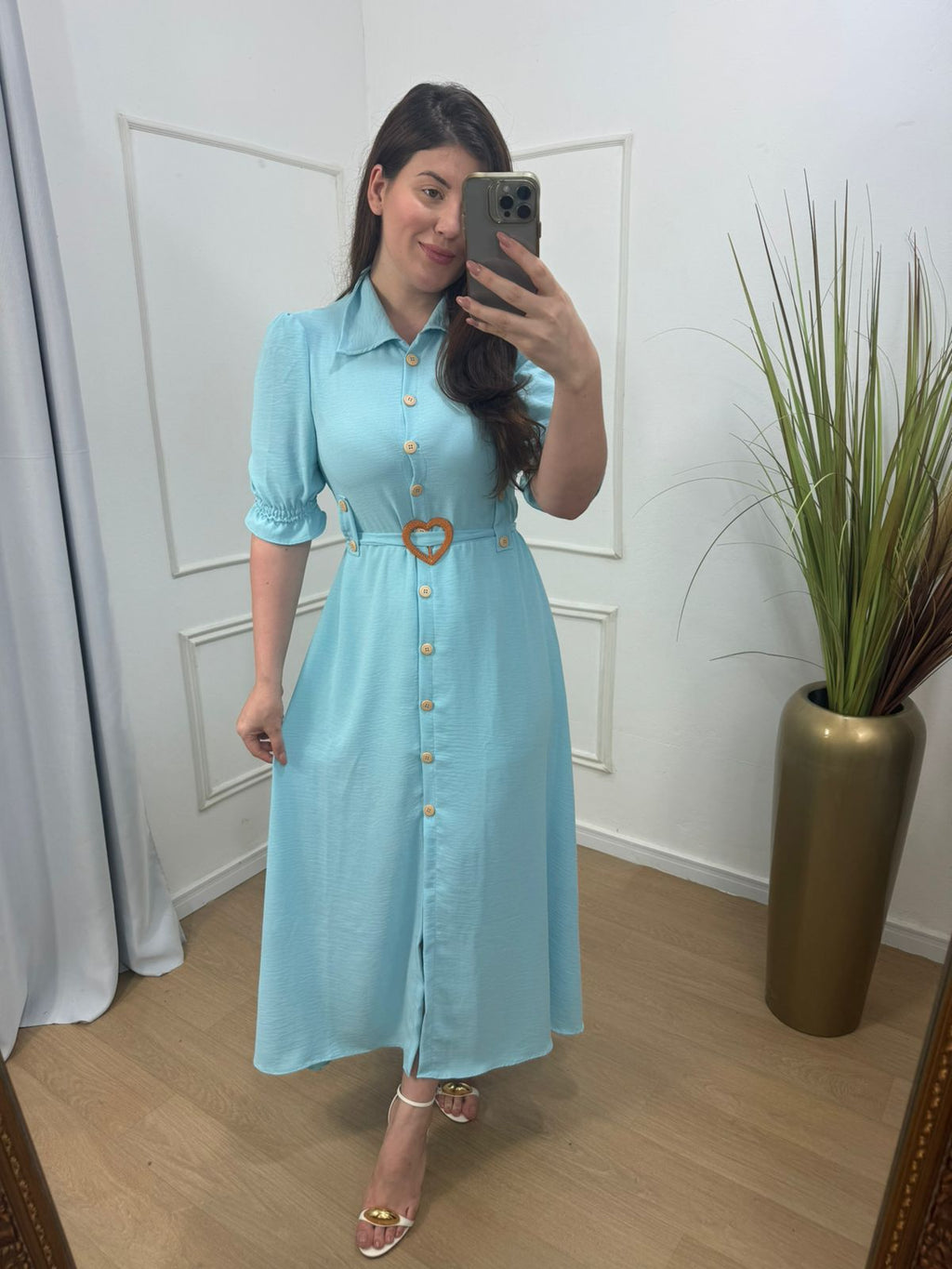 Vestido super midi em crepe Duna forrado, acompanha faixa de coração, botões são funcionais.