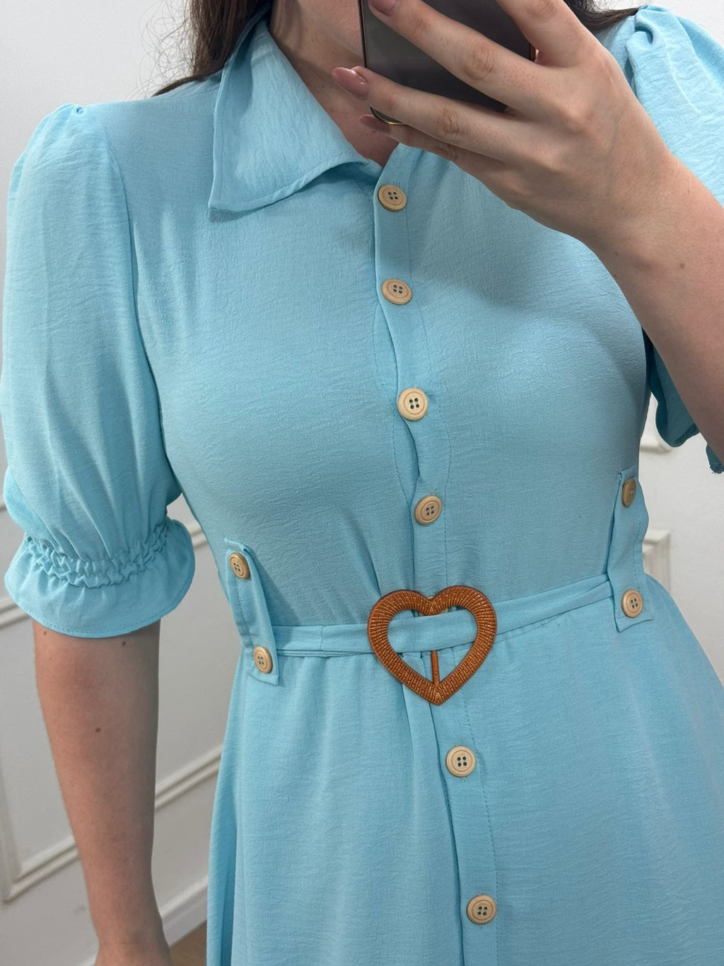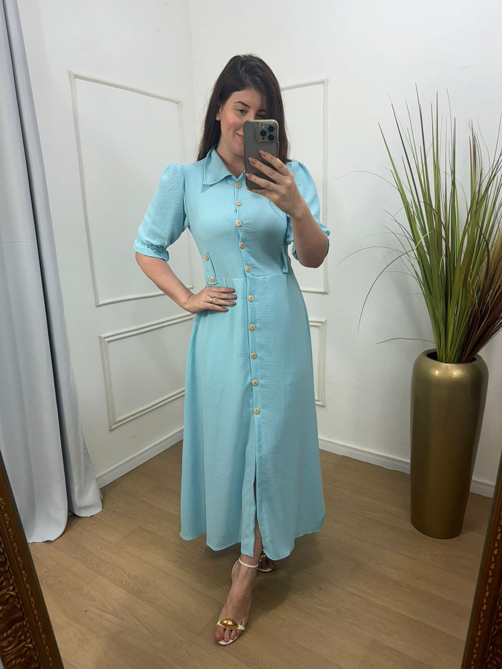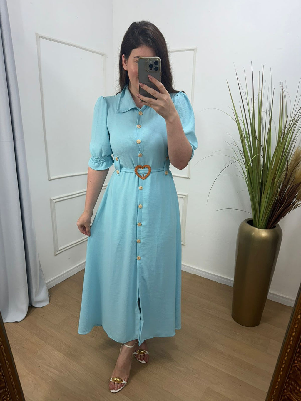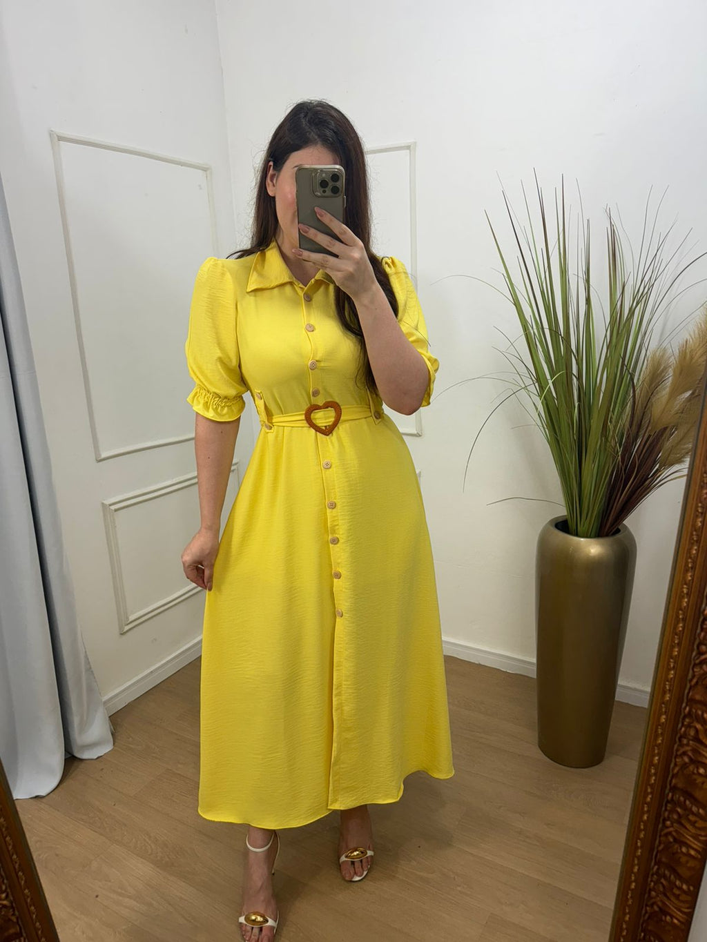 Vestido super midi em crepe Duna forrado, acompanha faixa de coração, botões são funcionais.
