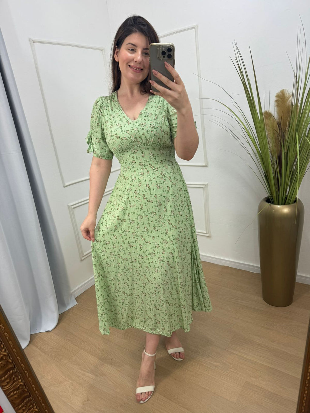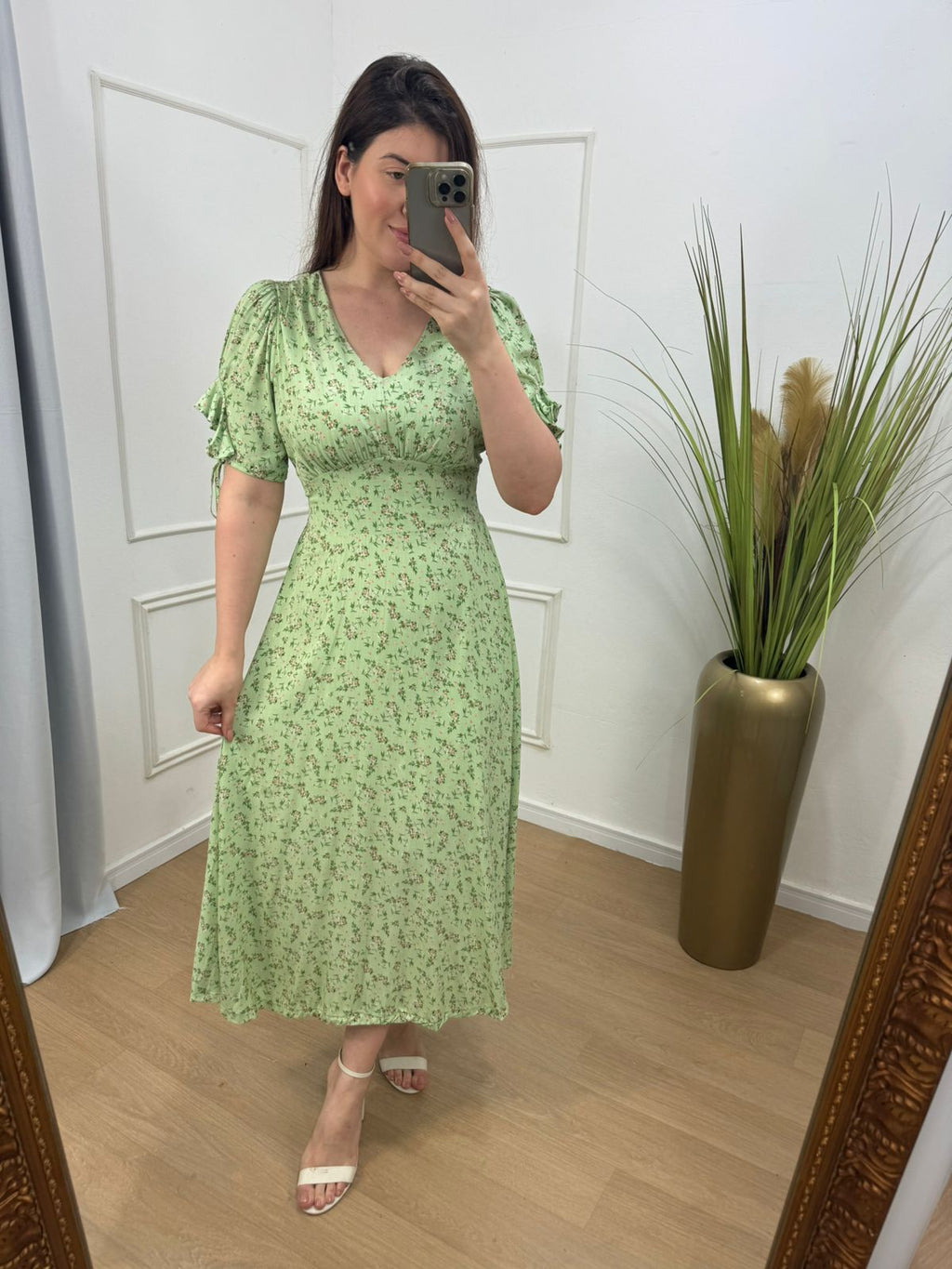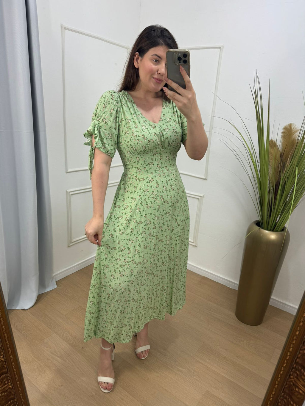 vestido midi forrado lastex nas costas, manga com amarração, esse modelo fica perfeito.