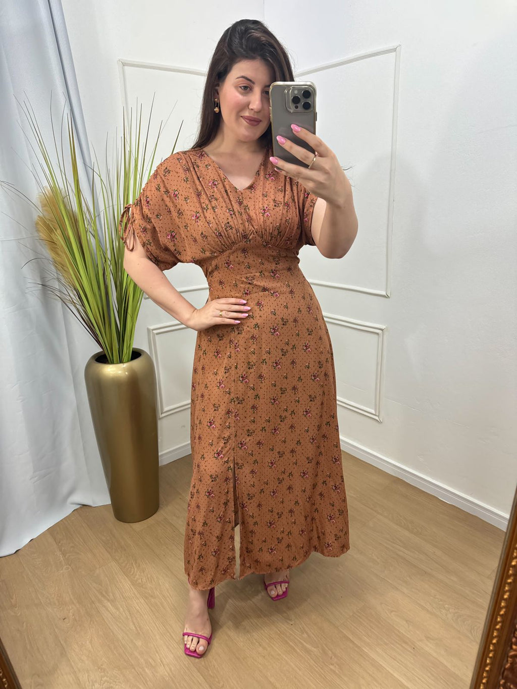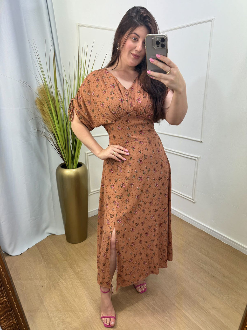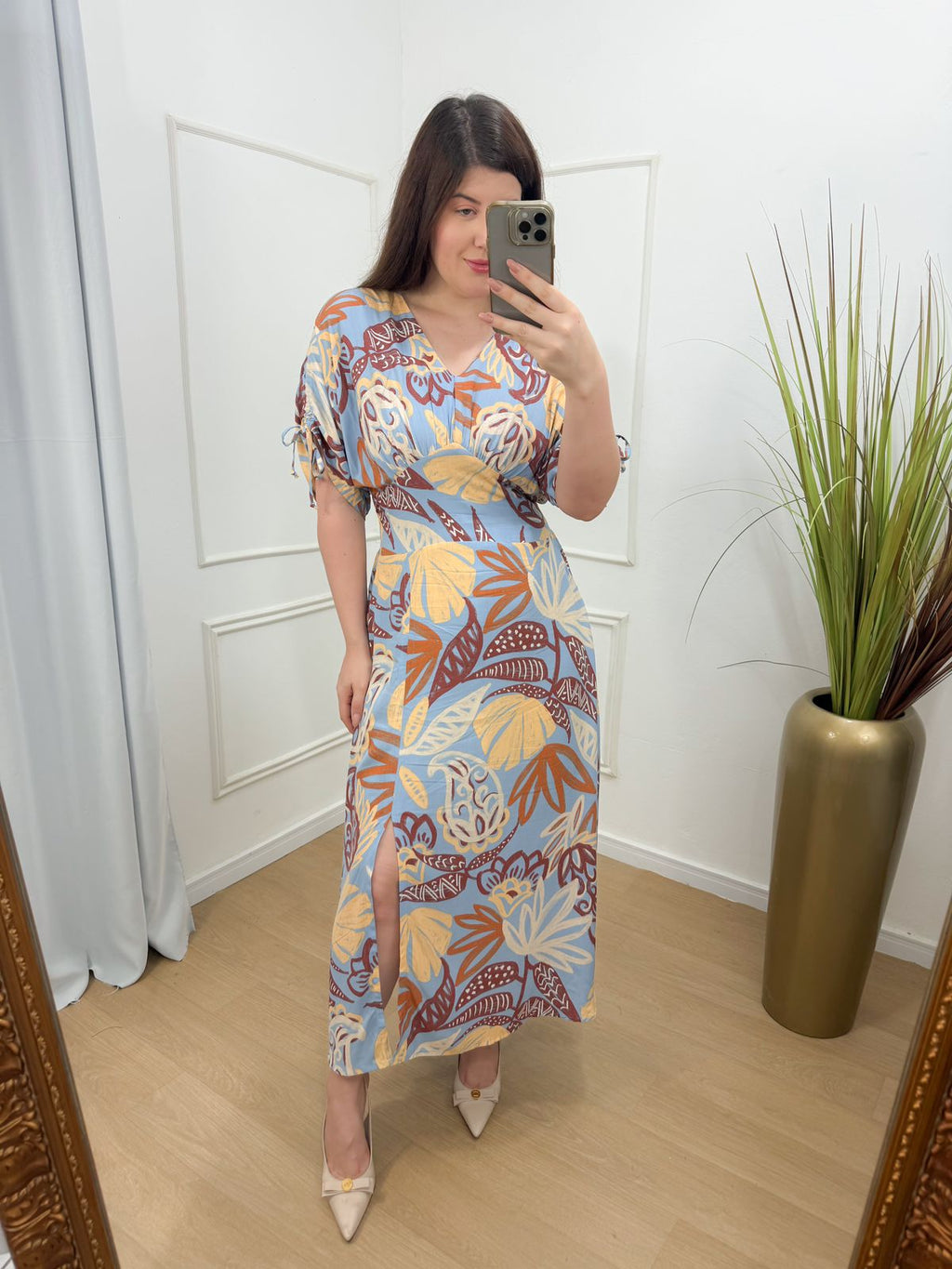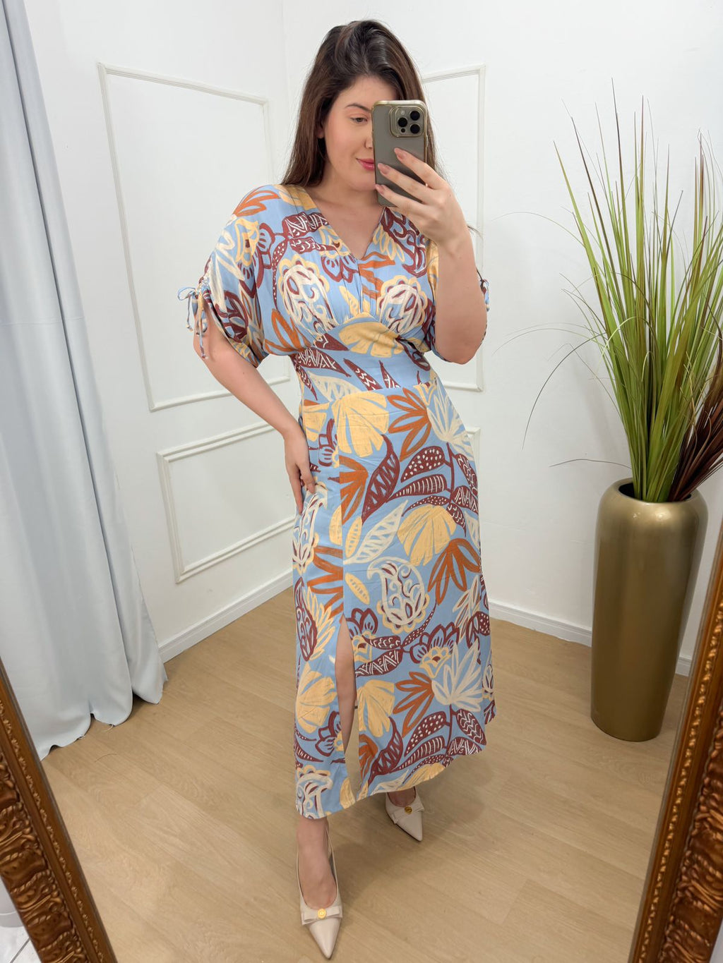 Descrição: vestido viscose forrado lastex nas costas, manga com regulagem, fenda abaixo do joelho.