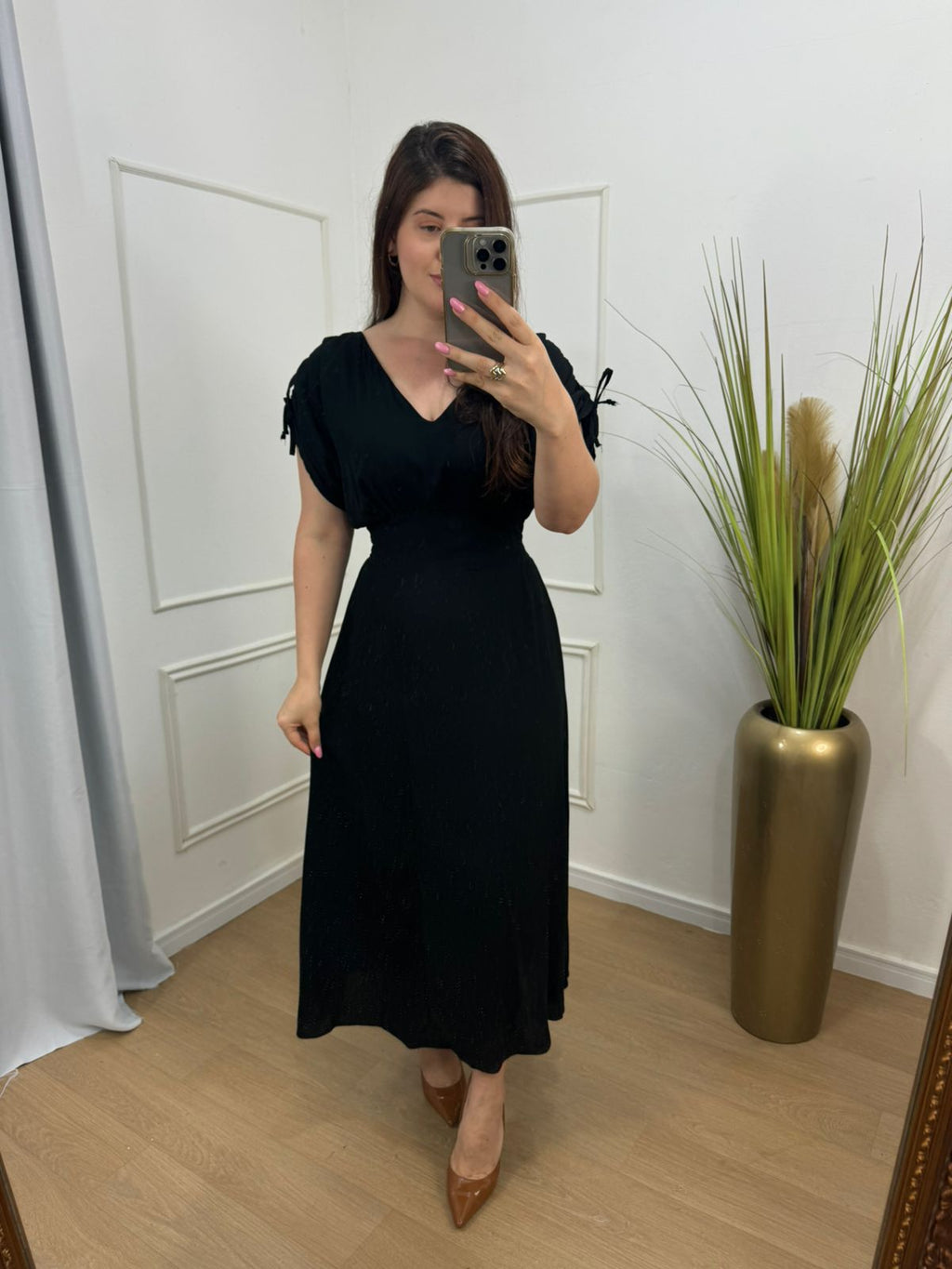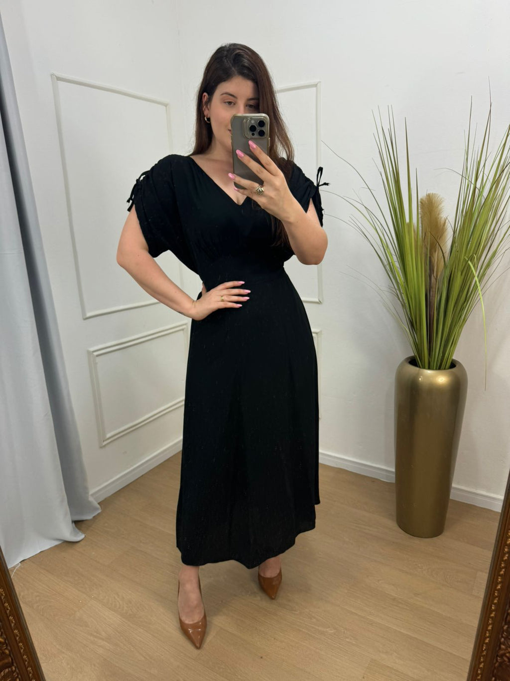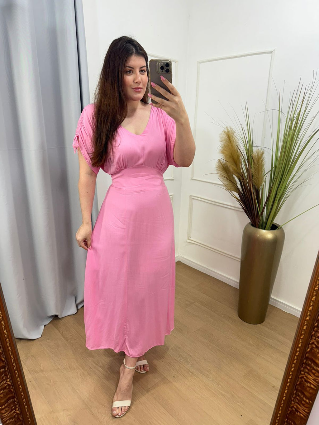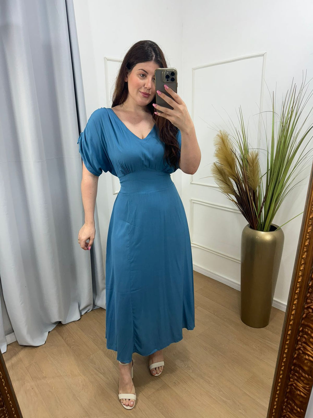 Vestido viscose forrado lastex nas costas, manga com regulagem, fenda abaixo do joelho.