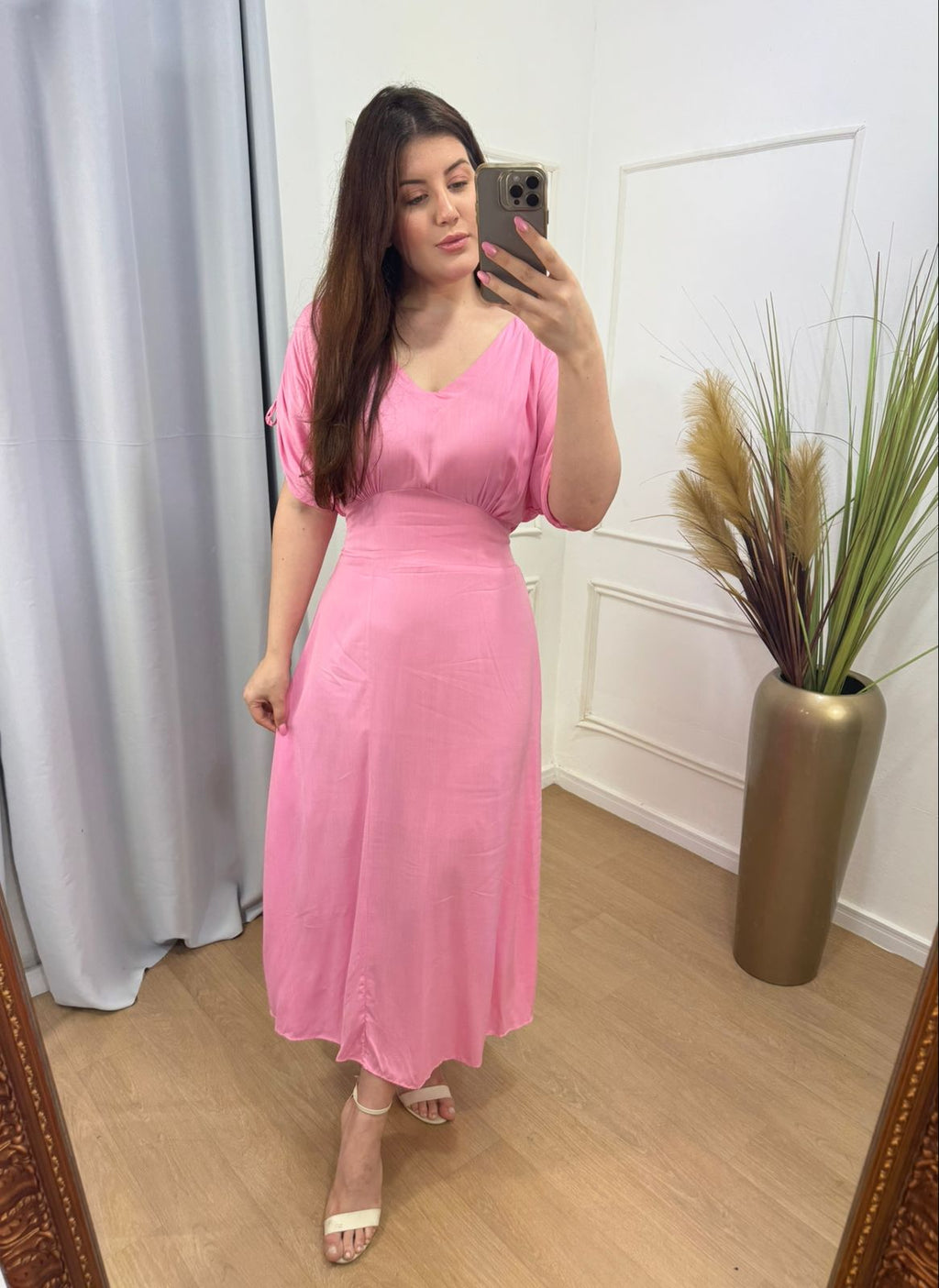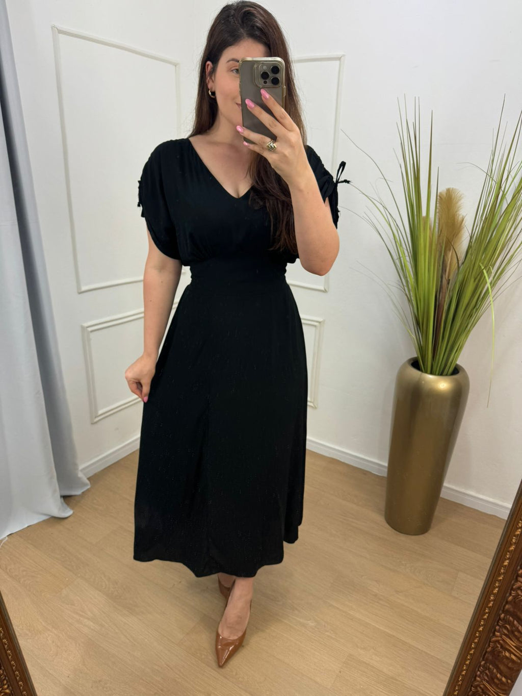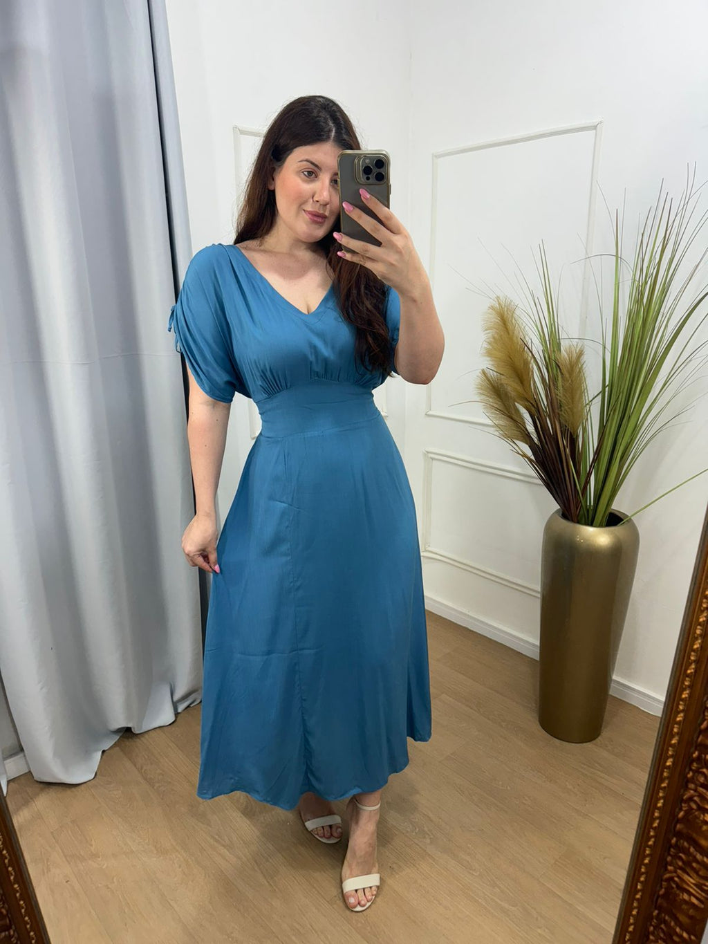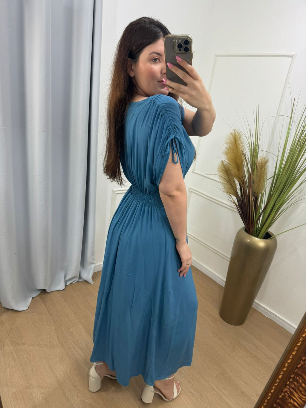 Vestido viscose forrado lastex nas costas, manga com regulagem, fenda abaixo do joelho.