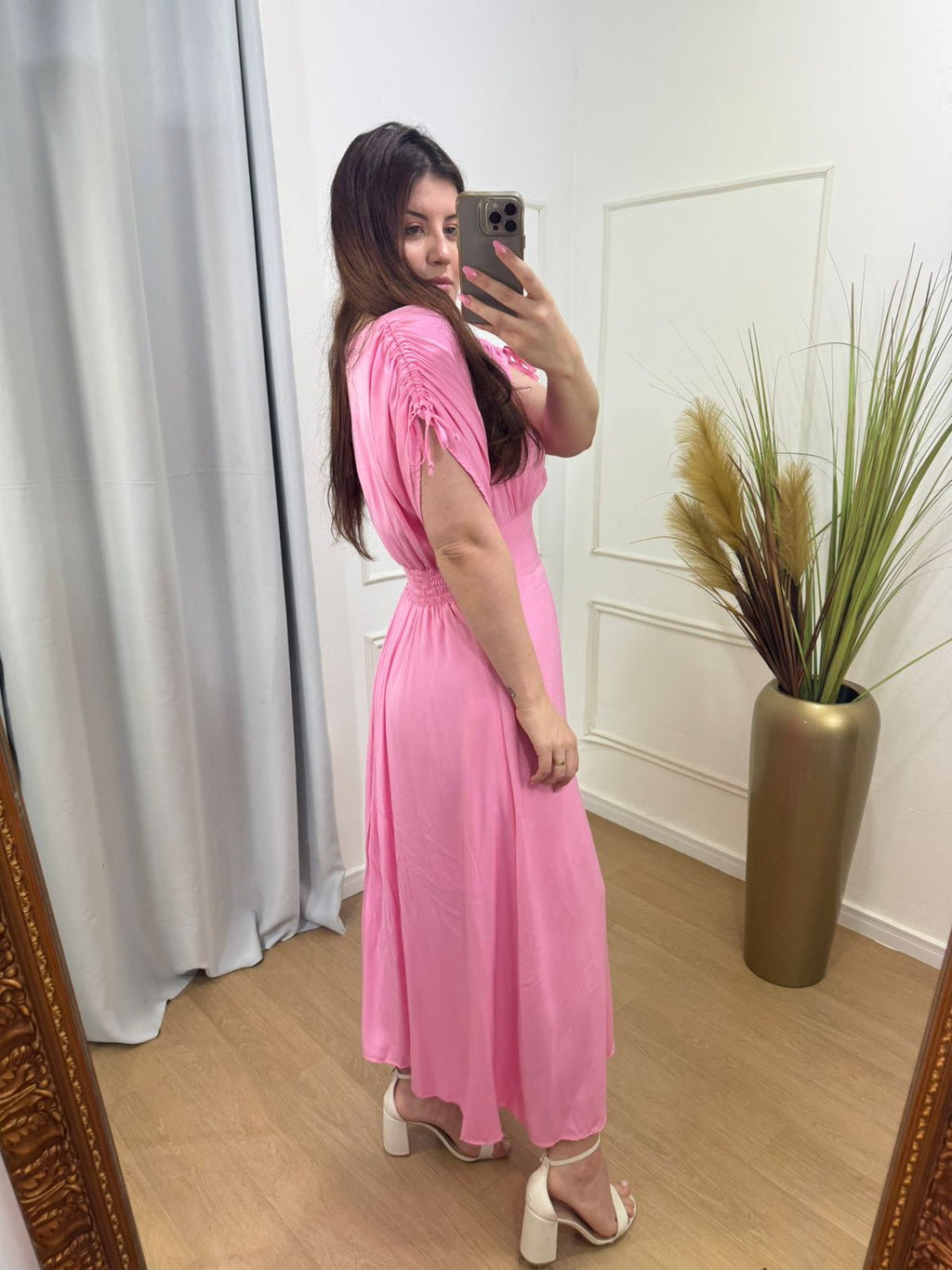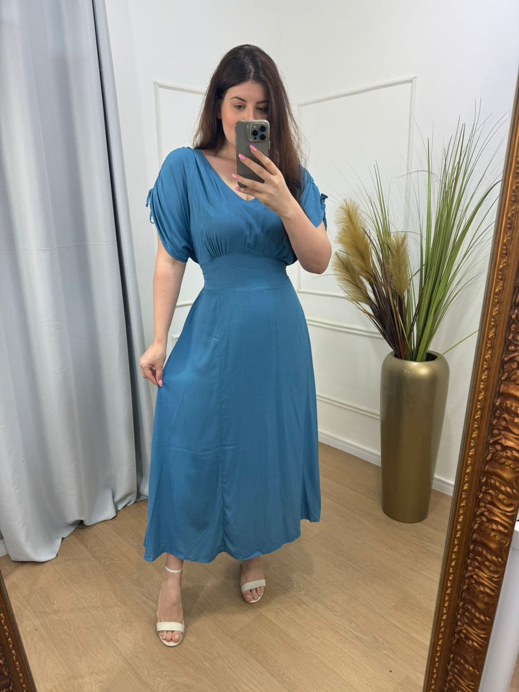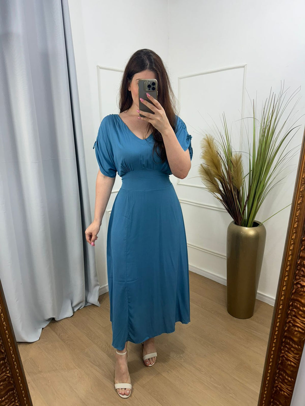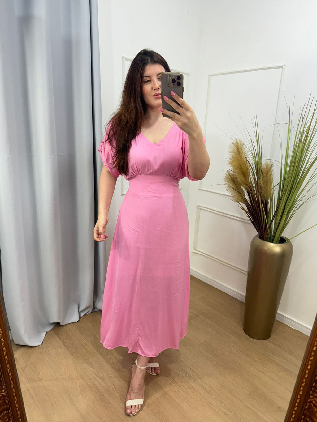 Vestido viscose forrado lastex nas costas, manga com regulagem, fenda abaixo do joelho.