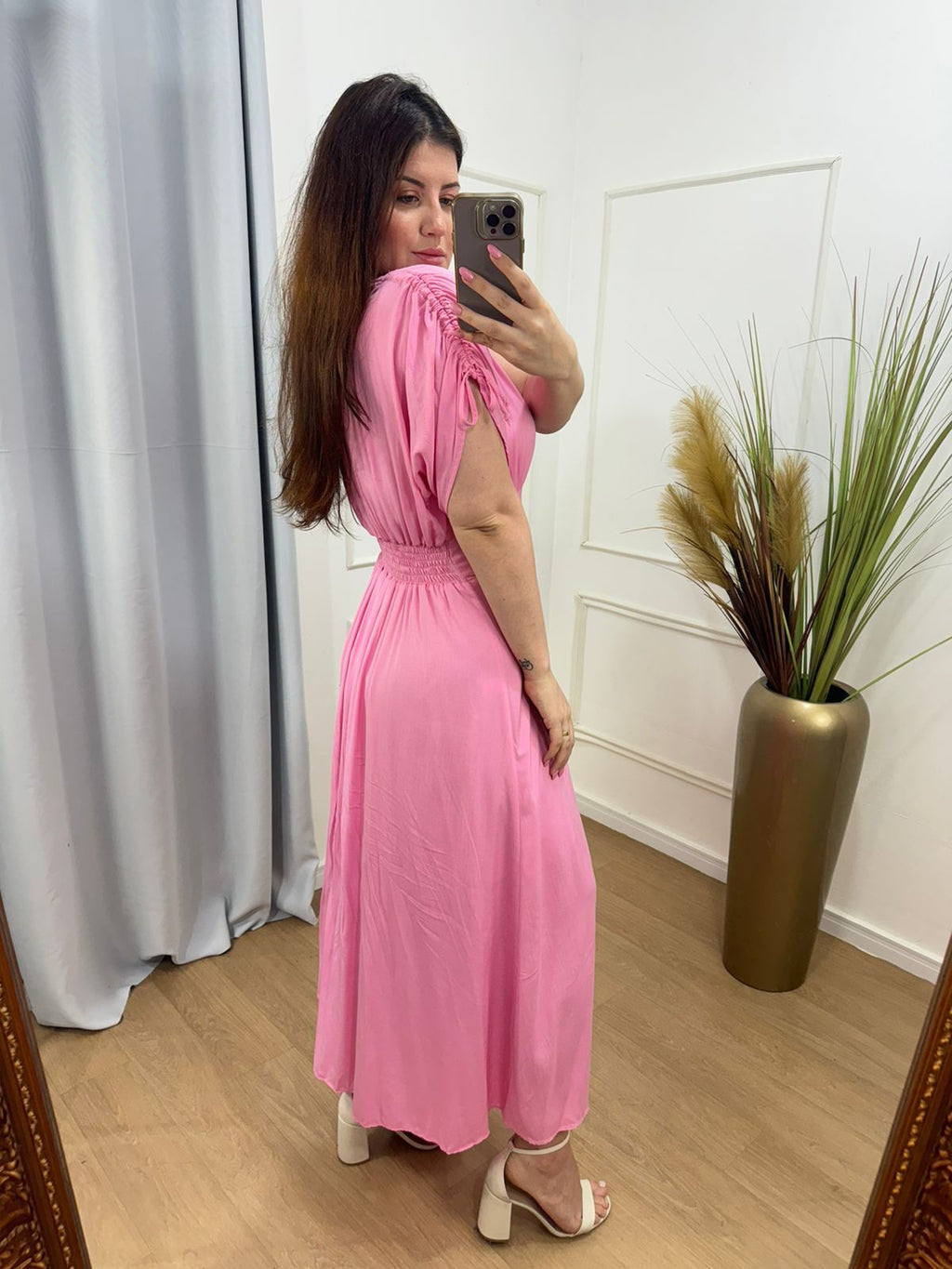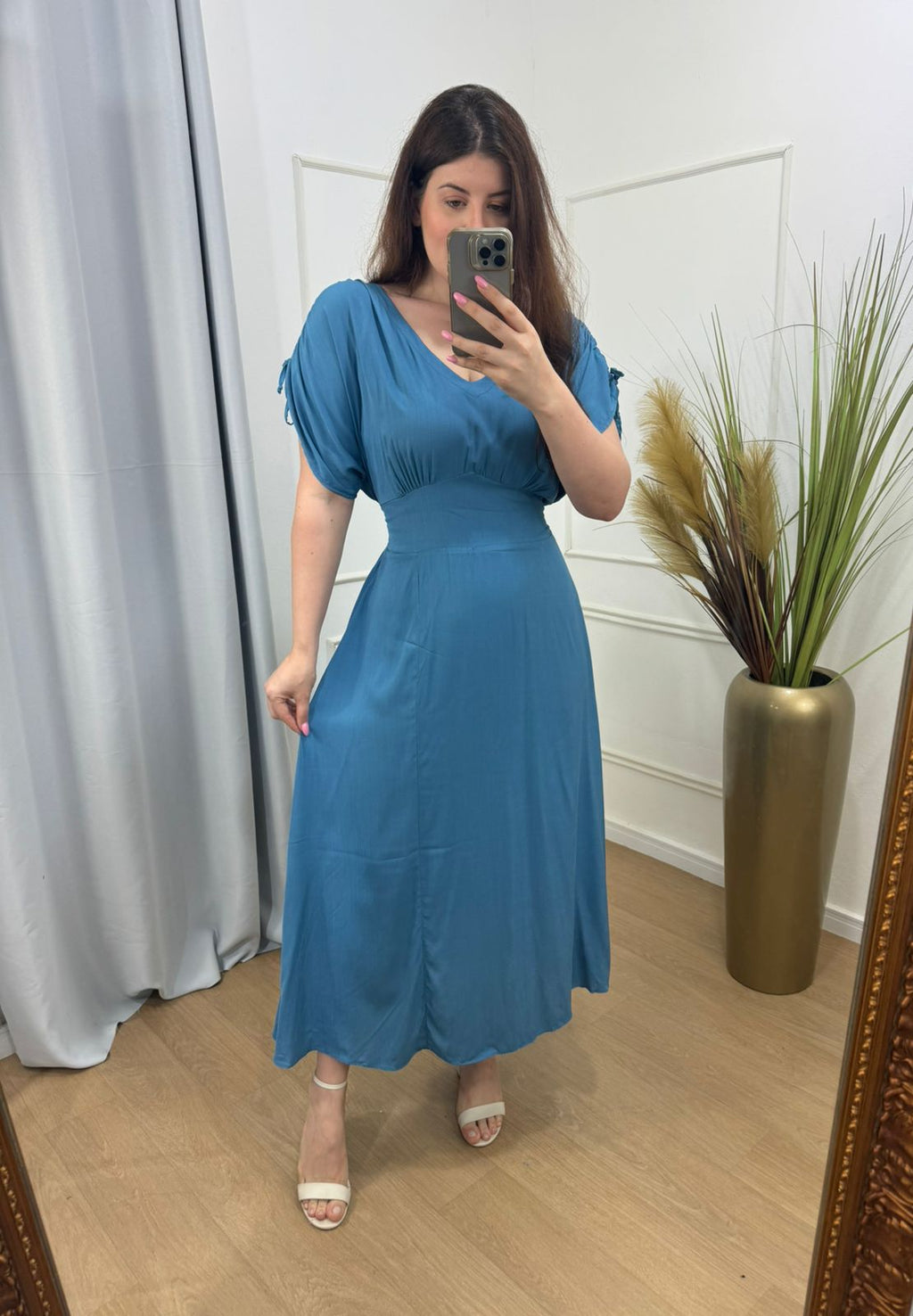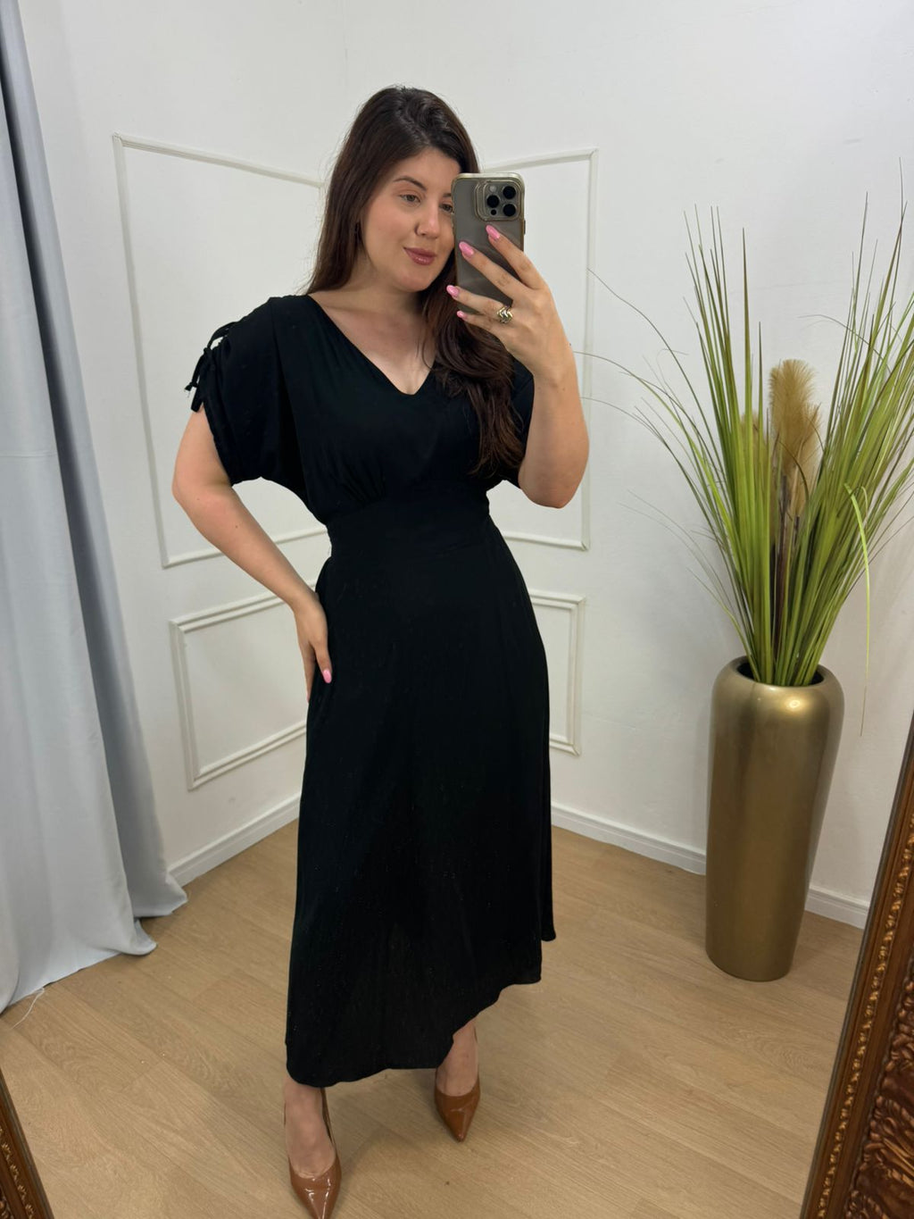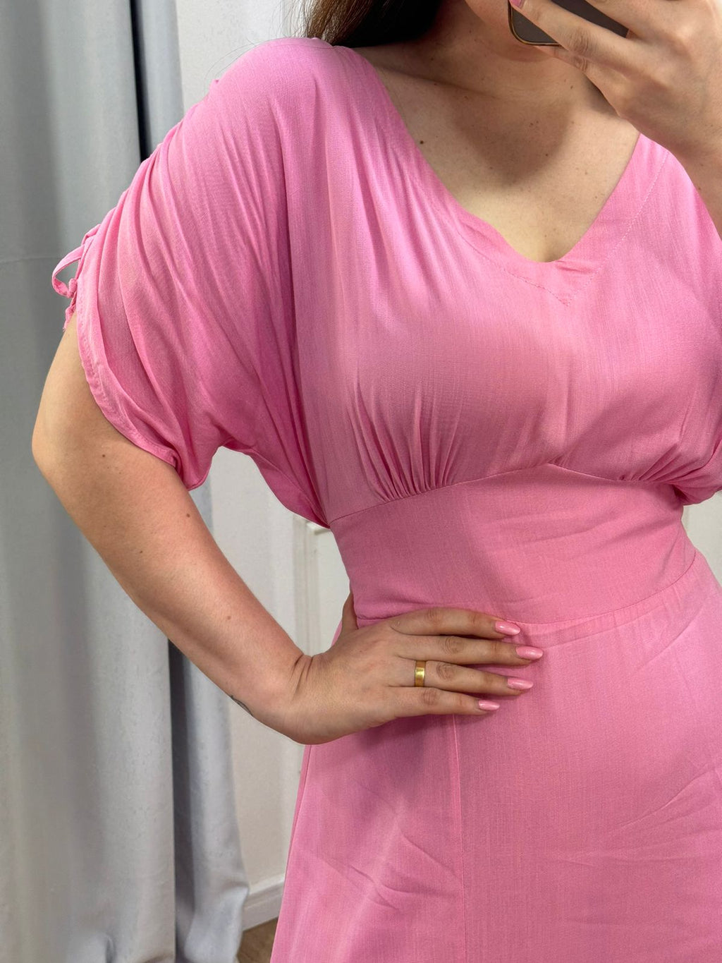 Vestido viscose forrado lastex nas costas, manga com regulagem, fenda abaixo do joelho.