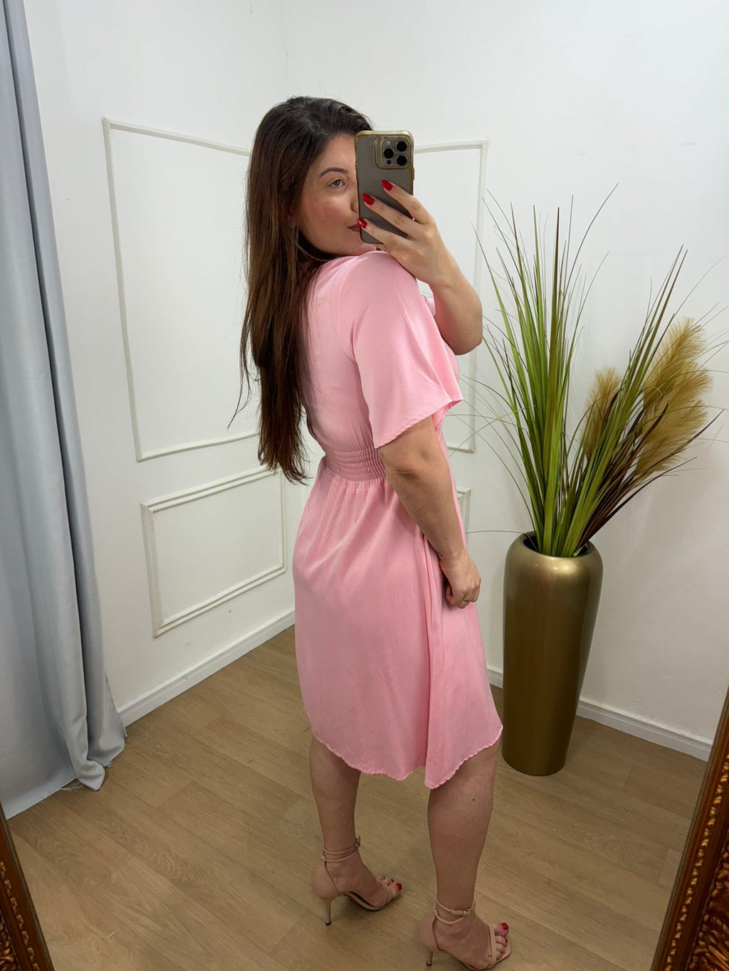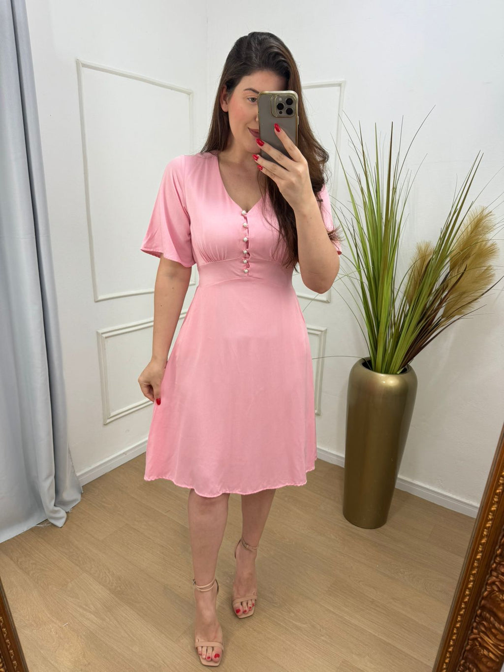Vestido em viscolinho forrado em botões Madre pérola possui bolsos.