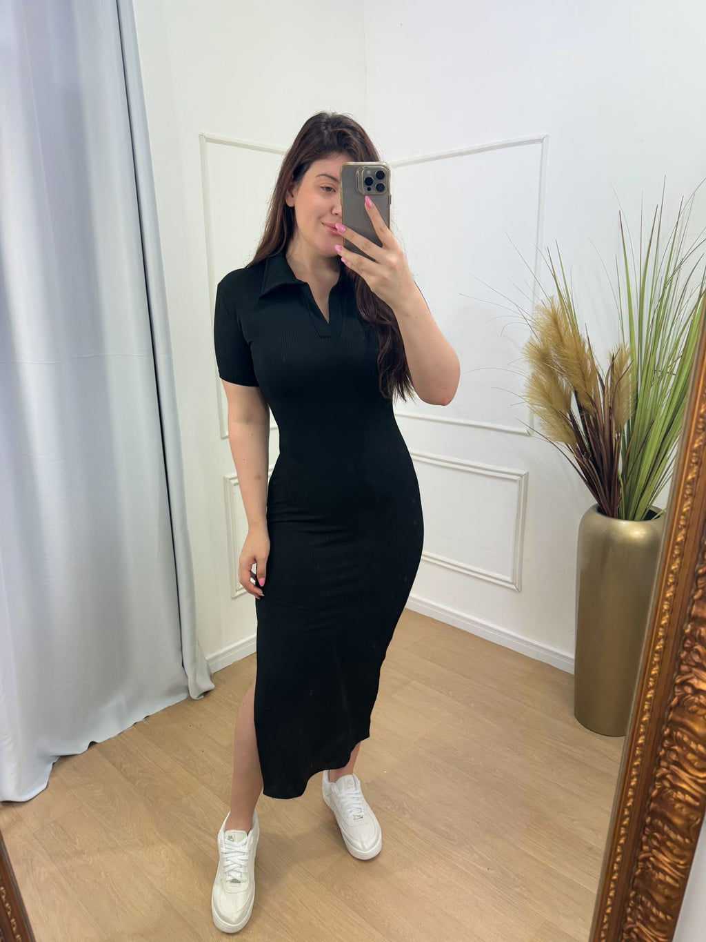 vestido na malha ponto Roma ( extremamente encorpada) modelo gola polo com fenda abaixo do joelho.