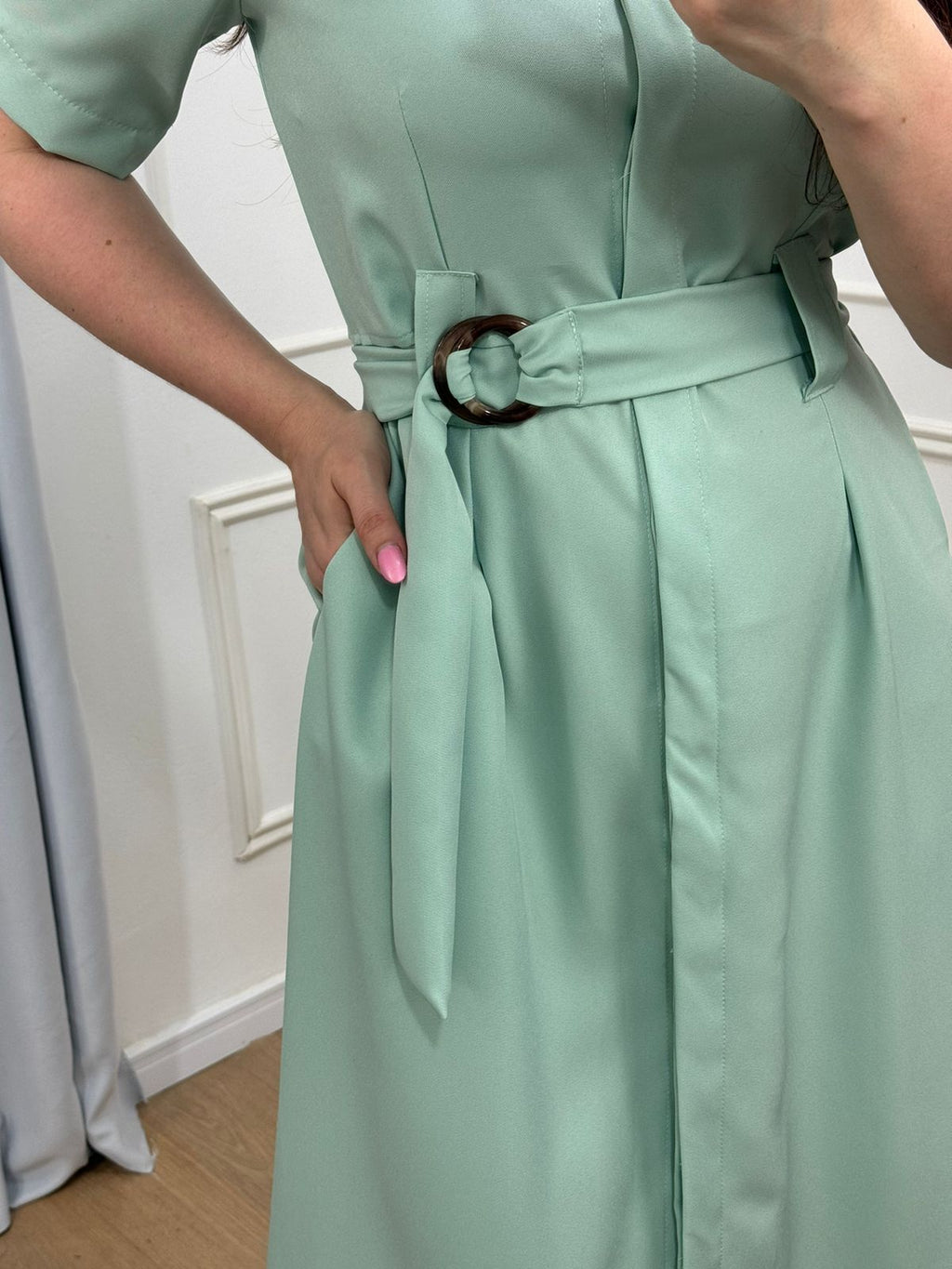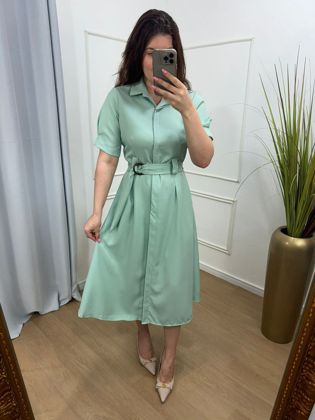 Vestido alfaiataria midi com bolsos , cinto , prega na manga e botões.