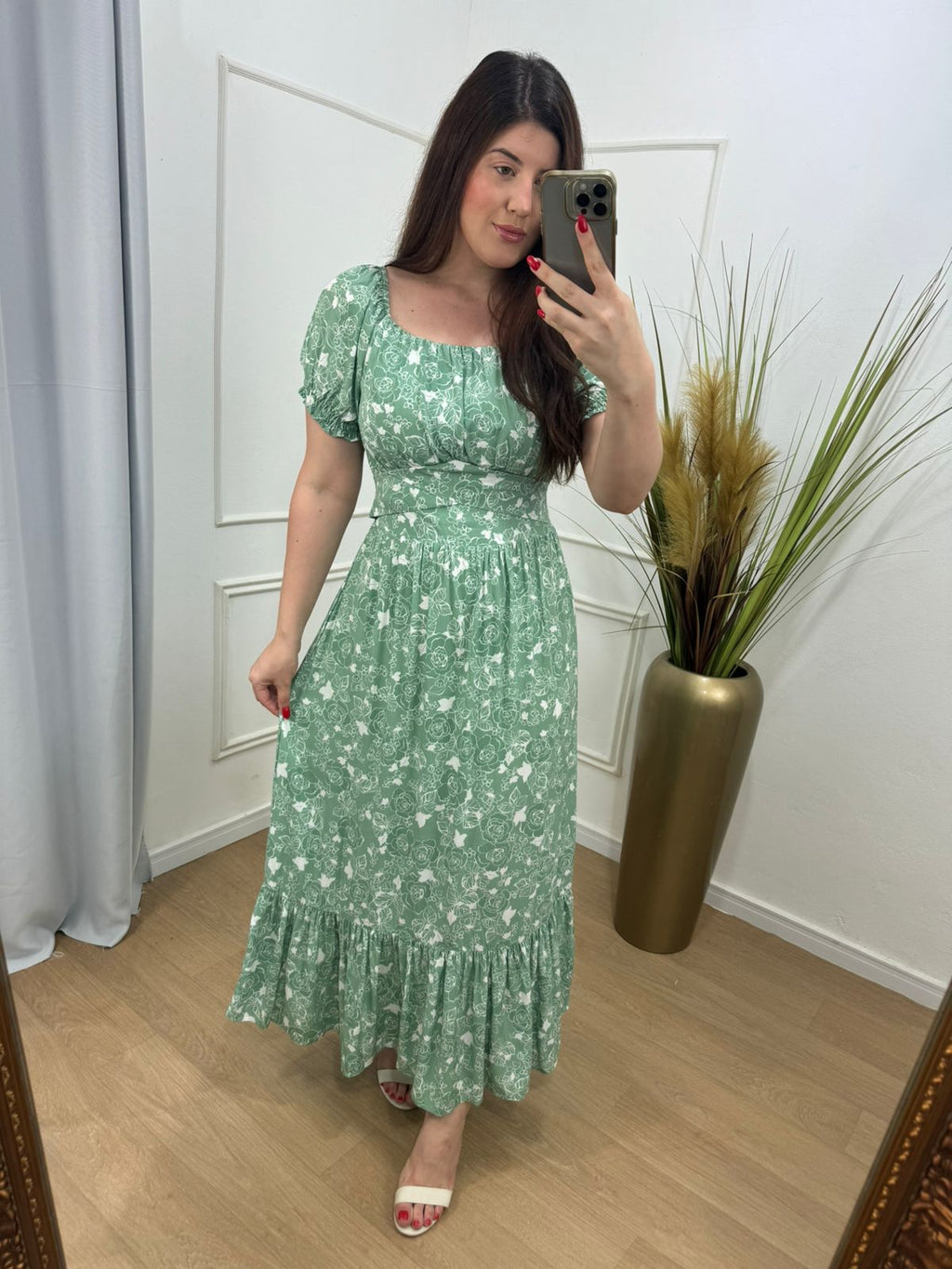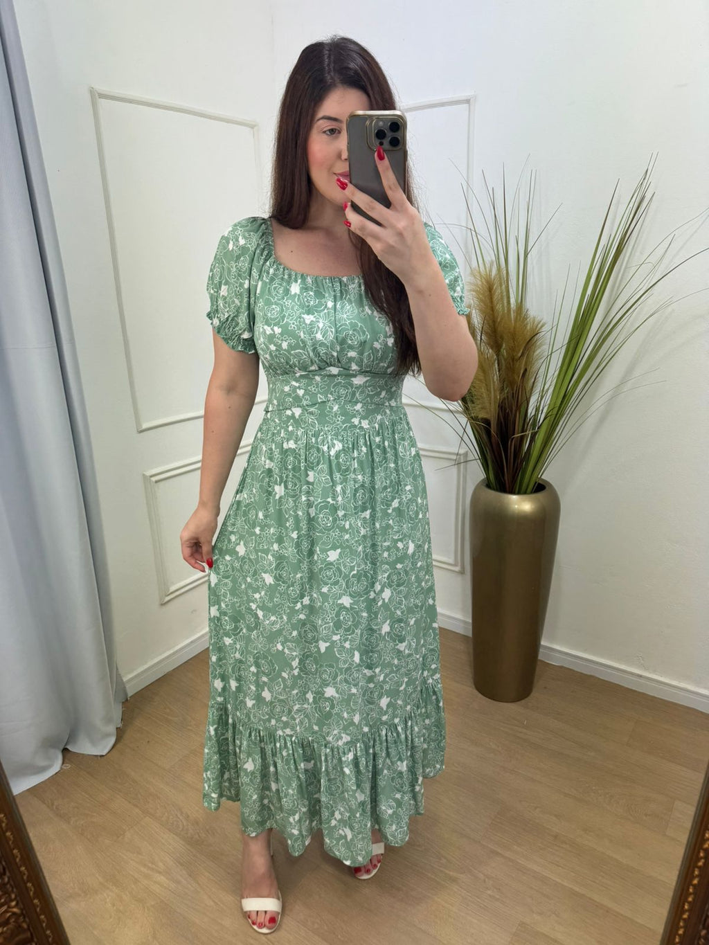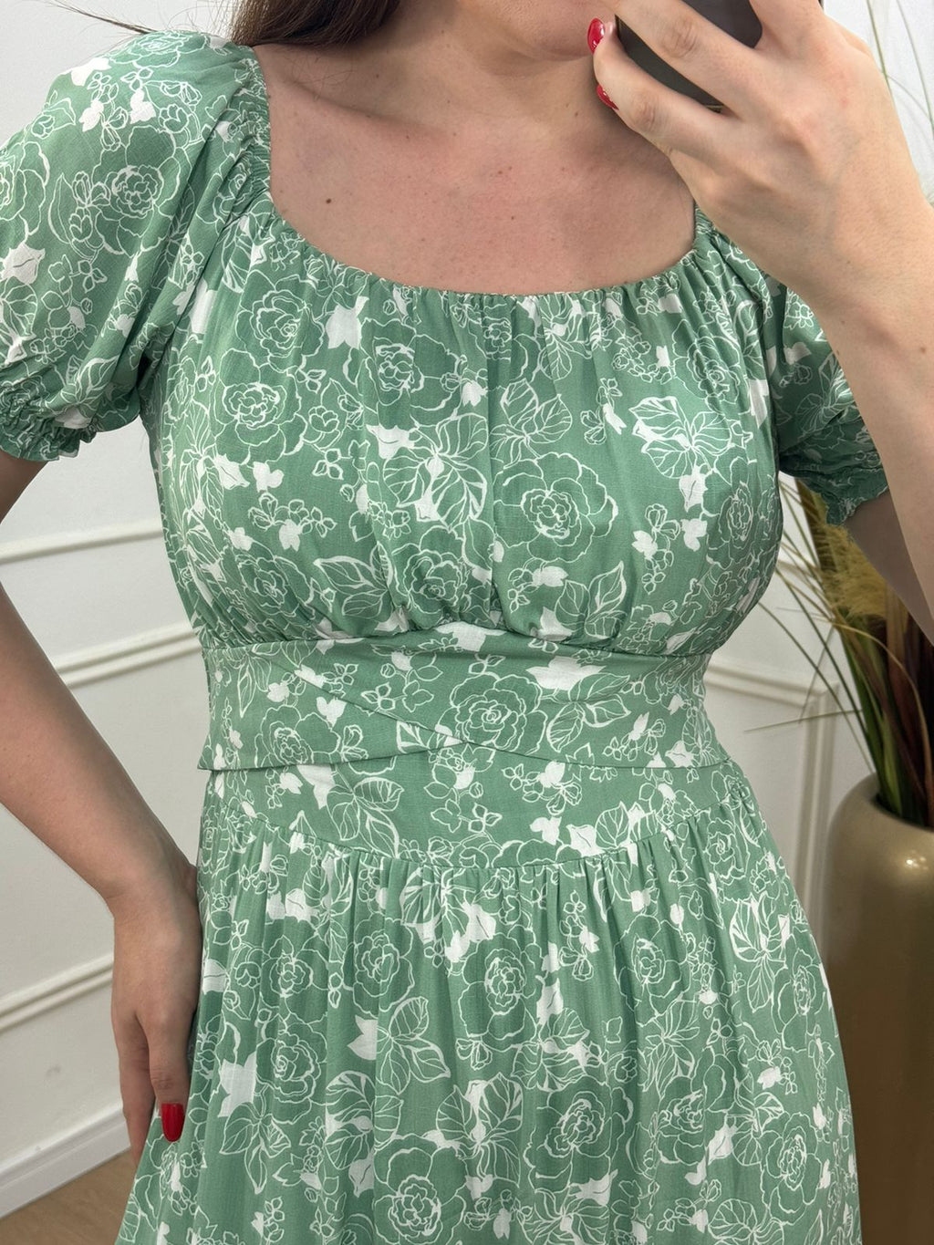Vestido verde menta estampado no viscolinho forrado, detalhe na cintura, elástico na manga e costas ( dá pra quem amamenta)